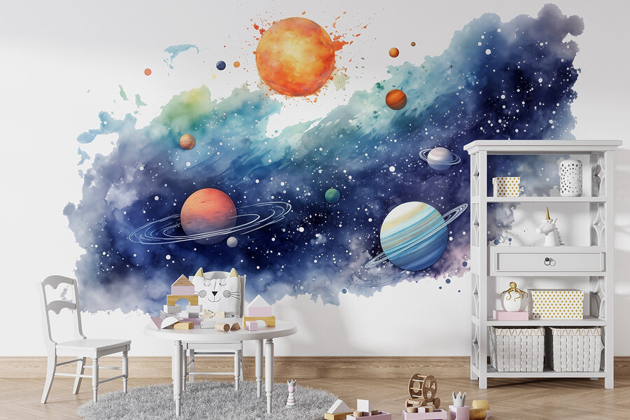 Transforma tu espacio en un país de las maravillas cósmicas con este impresionante mural, “Planetas en el cielo con planetas”. Es como llevar el universo al salón de tu casa, sin necesidad de cohetes. Imagínese tumbado, contemplando esos planetas bellamente elaborados y sintiéndose como si pudiera flotar entre las estrellas. El suave diseño de acuarela añade un toque de ensueño, haciendo que cualquier habitación parezca más amplia y aventurera.