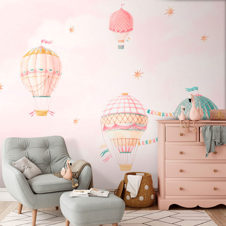 Imagínate flotando en una aventura de ensueño con este encantador mural de globos aerostáticos flotando perezosamente por un cielo en tonos pastel. Es como entrar en un libro de cuentos, donde cada mirada promete un toque de fantasía y una pizca de nostalgia. Perfecto para añadir un toque de magia a la habitación de tu hija, le hará soñar con cielos llenos de posibilidades. Cada globo parece susurrar historias de tierras lejanas y horizontes infinitos. Un suave recordatorio de que el cielo no es el límite, ¡sólo es el principio!