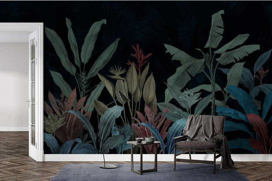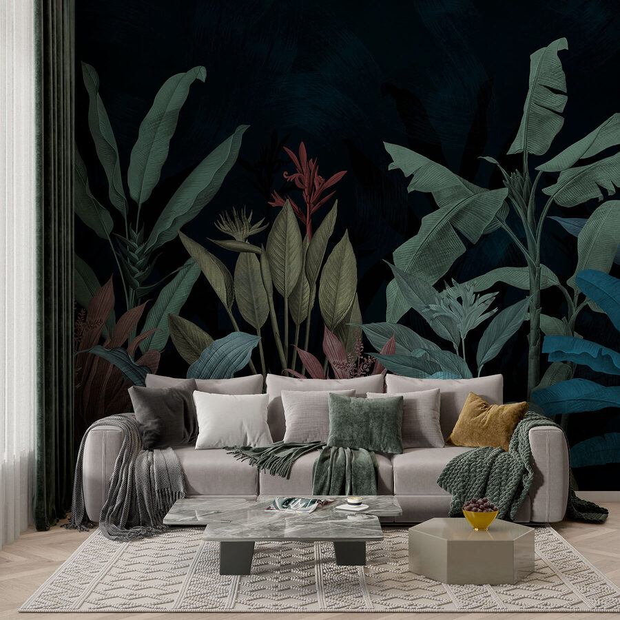 Imagine entrar en una habitación y sentir que se adentra en una encantadora selva nocturna. Eso es lo que ofrece “Serenata nocturna en verde y azul”. Este mural no es sólo un revestimiento de pared, es un estado de ánimo. Verdes y azules intensos se combinan como una tranquila sinfonía nocturna, perfecta para un lugar donde relajarse. Imagínatelo: has tenido un largo día y quieres relajarte. Estas frondosas hojas te acunan en sus brazos, susurrándote historias de trópicos lejanos. Es como una aventura lejana sin jet lag.