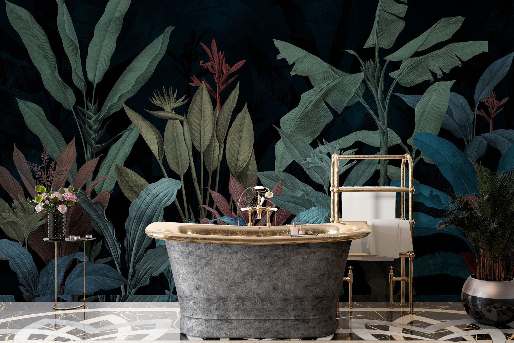 Imagine entrar en una habitación y sentir que se adentra en una encantadora selva nocturna. Eso es lo que ofrece “Serenata nocturna en verde y azul”. Este mural no es sólo un revestimiento de pared, es un estado de ánimo. Verdes y azules intensos se combinan como una tranquila sinfonía nocturna, perfecta para un lugar donde relajarse. Imagínatelo: has tenido un largo día y quieres relajarte. Estas frondosas hojas te acunan en sus brazos, susurrándote historias de trópicos lejanos. Es como una aventura lejana sin jet lag.