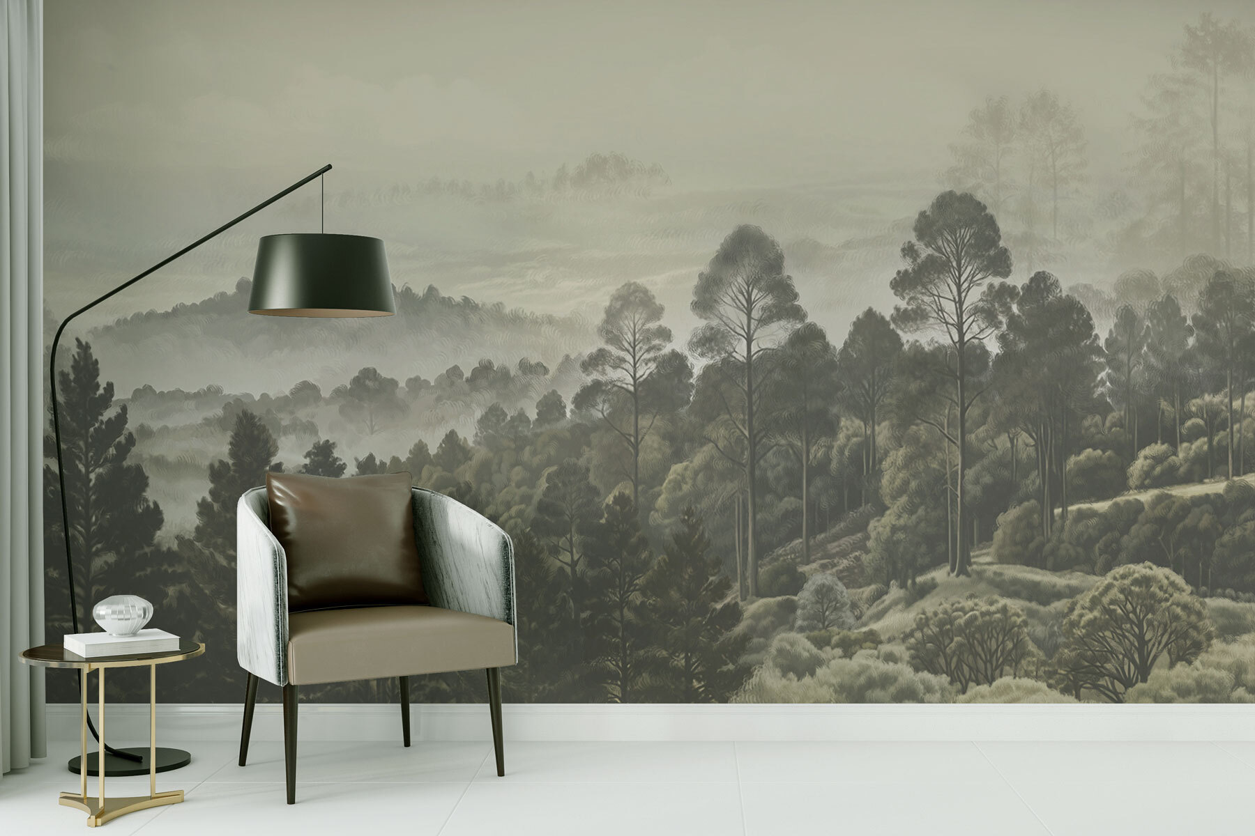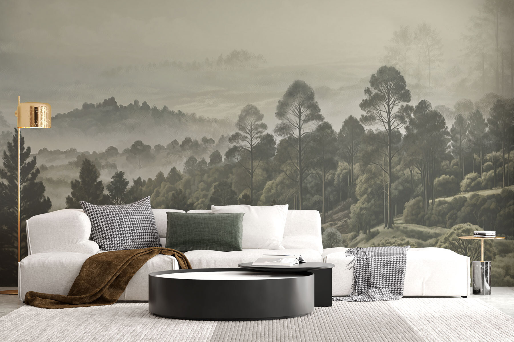 Imagina que te tomas un café en el salón, pero en lugar de mirar una pared lisa, tienes un mural de ensueño con árboles y niebla. Es como estar envuelto en un acogedor y brumoso paseo matutino por el bosque, sin bichos, por supuesto. Los verdes apagados y los grises suaves se sienten como un suave abrazo, creando la zona chill-out perfecta. Puede que hasta te olvides de que estás dentro. No es sólo un mural, es una sensación. Una escapada sutil sin salir de casa. No te sorprendas si tus invitados se quedan un poco más.
