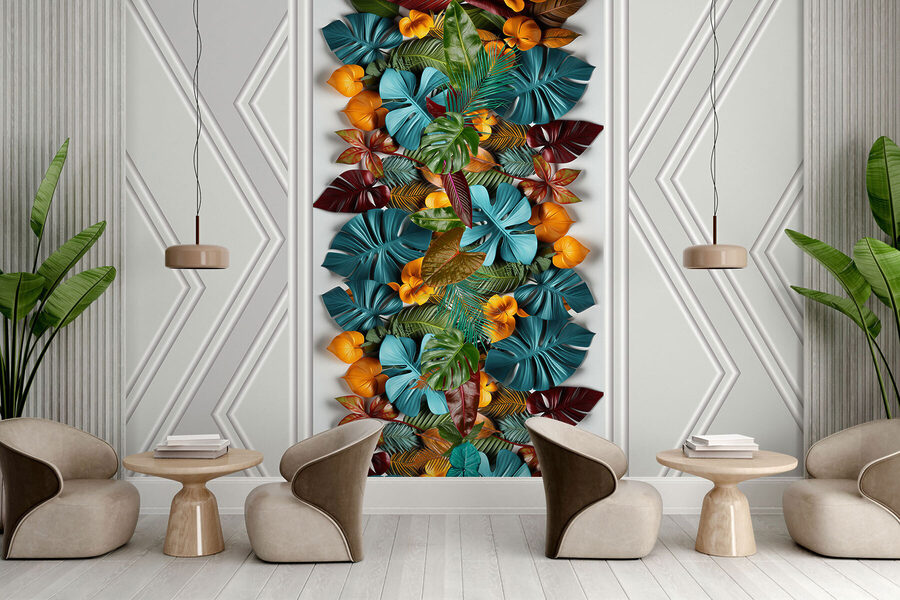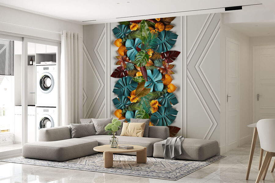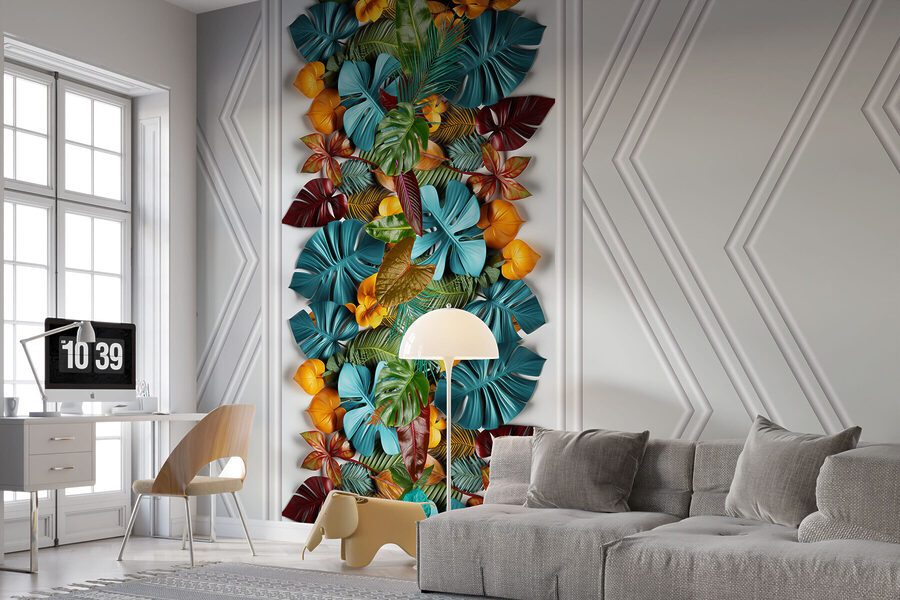 Transforme cualquier habitación con este encantador mural de pared que muestra una puerta blanca rodeada de un aluvión de hojas de colores. Es como llevar una soleada escapada tropical directamente a su espacio. Imagínese despertarse en una selva vibrante cada mañana: esos verdes vivos y esos toques de naranja están destinados a despertar la alegría y tal vez incluso a soñar despierto. Perfecto para una sala de estar o una oficina en casa, crea un telón de fondo juguetón que es a la vez relajante y energizante. Imagínate recibir a tus amigos y oírles hablar maravillas de tu decoración única. ¿Quién no querría disfrutar de un ambiente tan exuberante como éste? Se trata de disfrutar de una escapada sin salir de casa.