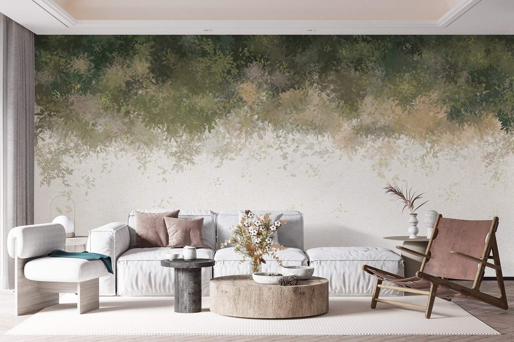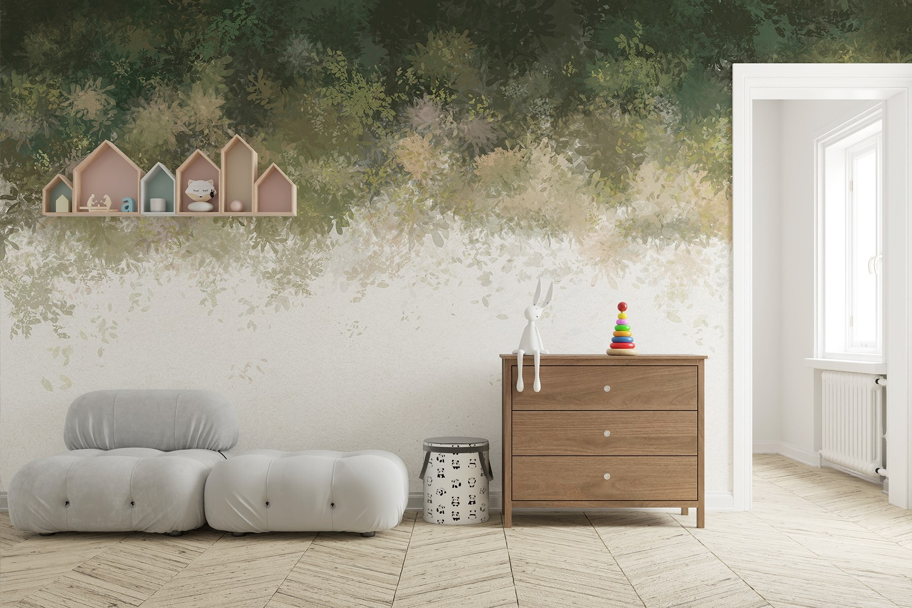 Imagine un día que se convierte en noche en el interior de su habitación. El mural “Tonos de atardecer que se mezclan con la noche” es como el gran final de la naturaleza: suaves verdes boscosos que salpican delicadas sombras. Es como si un bosque mágico decidiera acampar en tu pared. Perfecto para esas noches acogedoras en las que te acurrucas con un libro o simplemente sueñas despierto. Este mural susurra tranquilidad con un toque de fantasía. Imagínese a un invitado que entre y se detenga -sólo para contemplarlo- preguntándose cómo ha capturado el crepúsculo. Parece serenidad, ¿verdad?