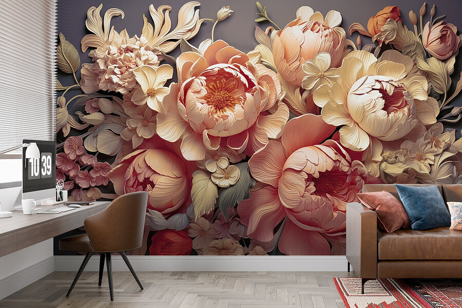 Imagínese que entra en un espacio donde las vibrantes peonías florecen en las paredes, como en una eterna fiesta en el jardín. Este mural, con su suave fondo gris, resalta a la perfección los vivos colores de las flores, dándole un aire fresco y acogedor. Es como un soplo de primavera, independientemente de la estación del año.