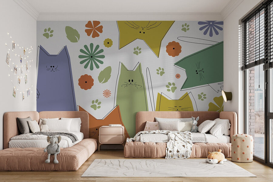 Aporta un toque de fantasía a cualquier habitación con este encantador mural de pared que muestra un extravagante grupo de gatos retozando entre vibrantes flores y hojas. Imagina esas encantadoras caritas asomando mientras saltan de pared en pared, su energía juguetona iluminando tu espacio. Perfecto para los amantes de los gatos: ¿quién no quiere que su decoración refleje un poco de personalidad? Es como tener una mascota sin tener que limpiar la caja de arena. Imagínese acogedoras tardes en un paraíso lleno de gatos, tomando el té y disfrutando de esas suaves vibraciones. Este mural no sólo decora, sino que cuenta una historia de alegría y diversión, haciendo que cualquier espacio se sienta como en casa.
