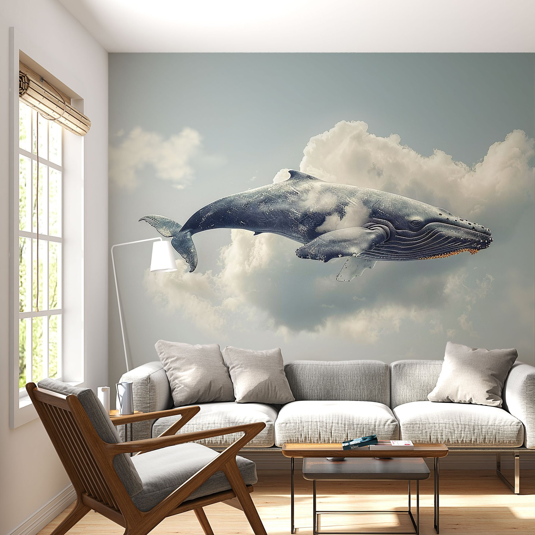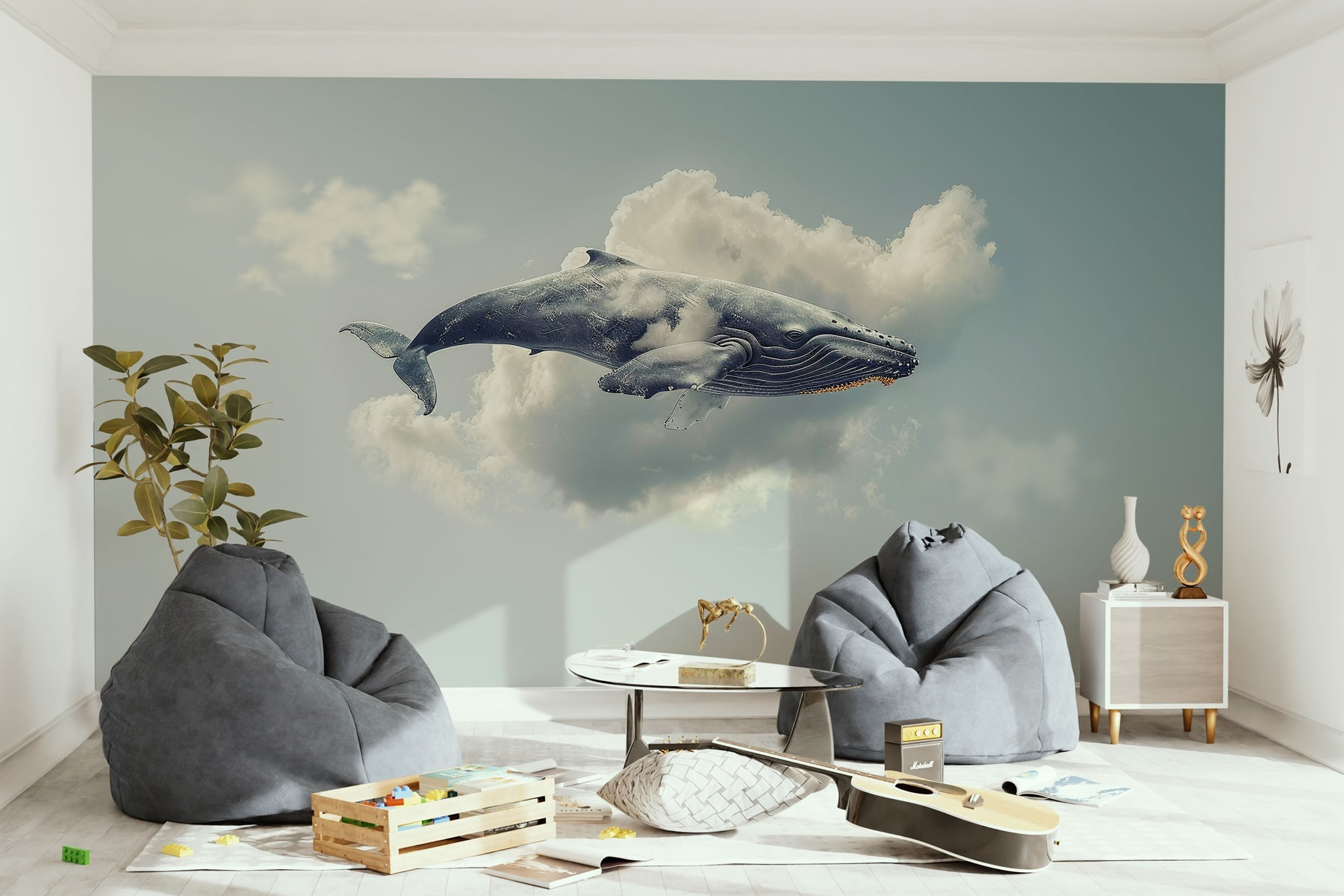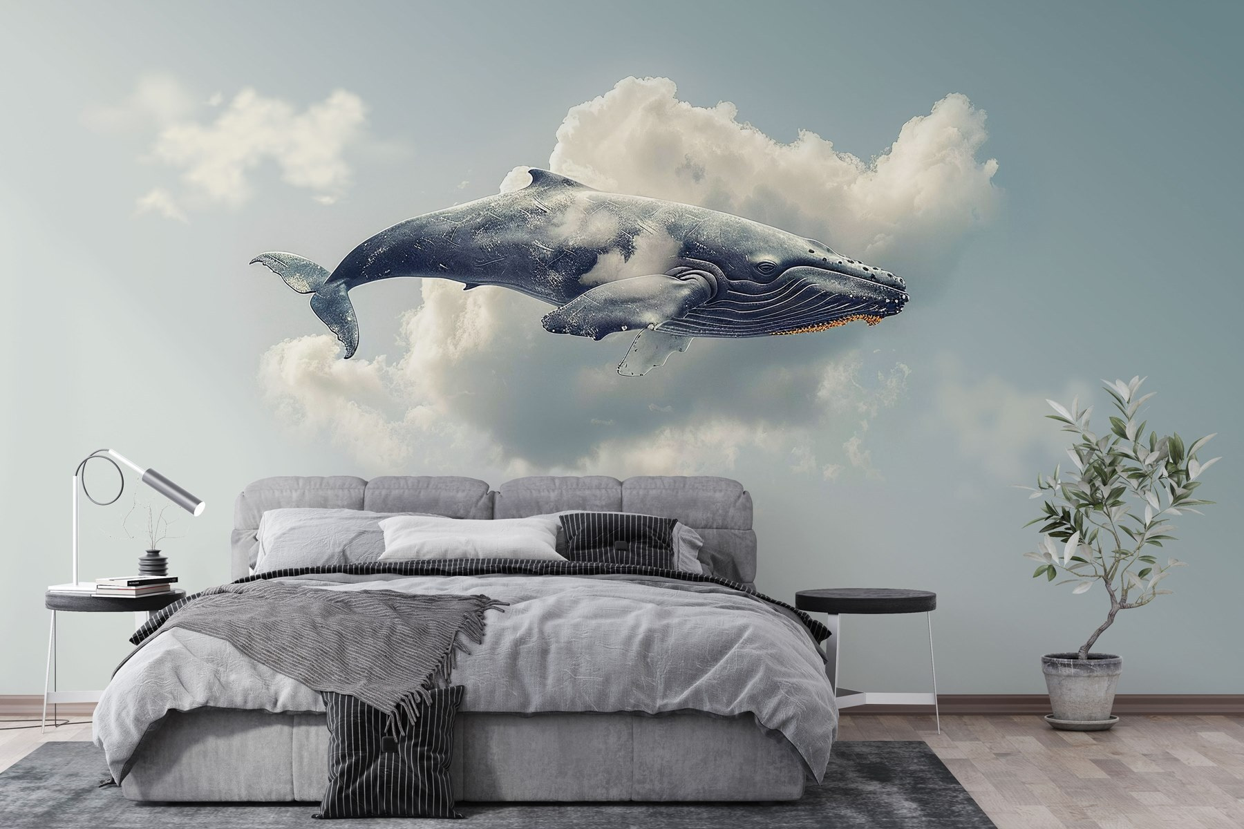 Los colores suaves y el ambiente sereno crean una sensación de calma. Piensa en lo encantador que sería sentarte en el sofá y contemplar esta obra maestra mientras te tomas el café de la mañana. No es sólo arte mural; es un tema de conversación. Los amigos sentirán curiosidad y los niños estarán encantados. ¿Quién no querría una simpática ballena dispuesta a compartir historias del cielo? Sumérgete en un mundo donde el océano se encuentra con las nubes y deja que tus paredes cuenten una historia.