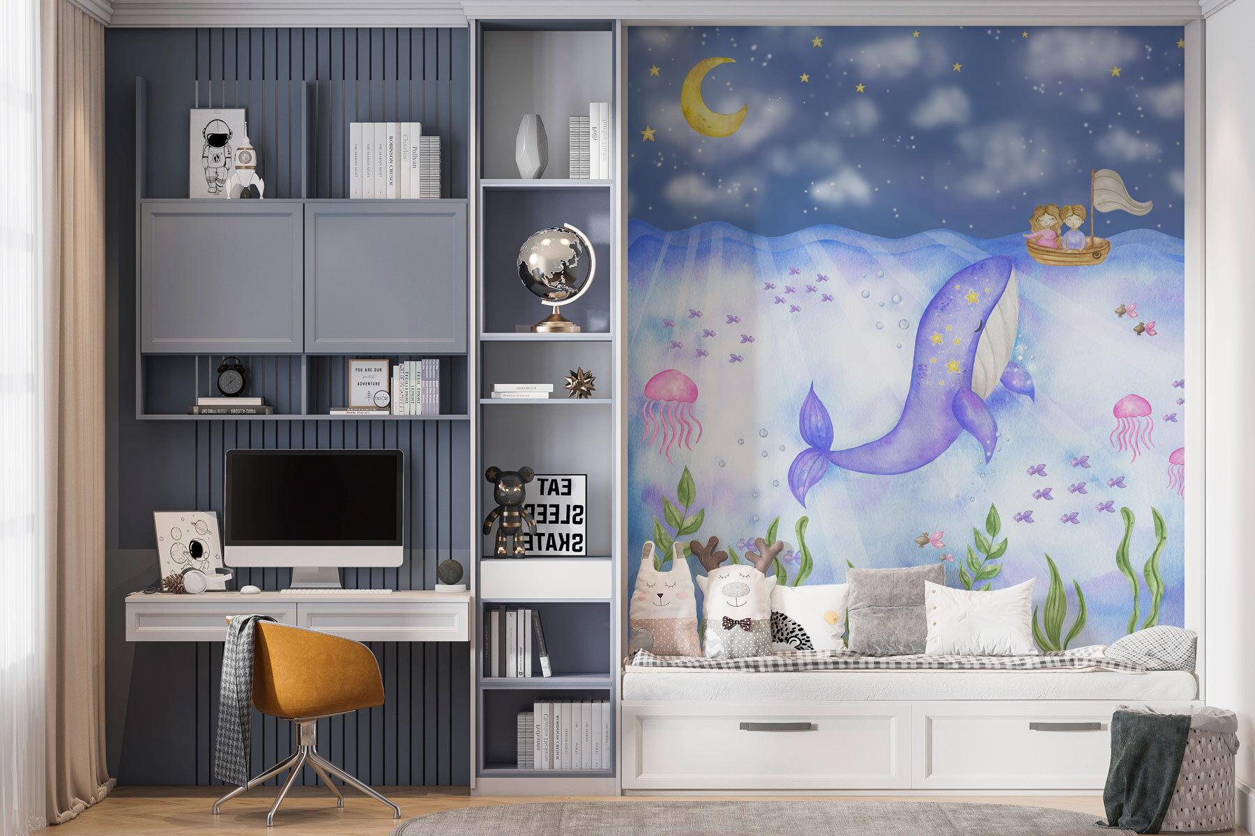 Sumérgete en un mágico mundo submarino con este caprichoso mural en el que aparecen una simpática ballena y una juguetona medusa. Imagina el suave vaivén de las olas del mar en el salón de tu casa. Los suaves tonos azules y morados crean un ambiente relajante, perfecto para un rincón acogedor o la habitación de un niño. Imagina a los más pequeños flotando hacia el país de los sueños, rodeados de estrellas de ensueño y burbujeantes aventuras. Es como una ventana al país de las maravillas del océano, que aporta un toque de alegría y creatividad a tu hogar. ¿A quién no le gustaría tener una alegre ballena vigilándole?