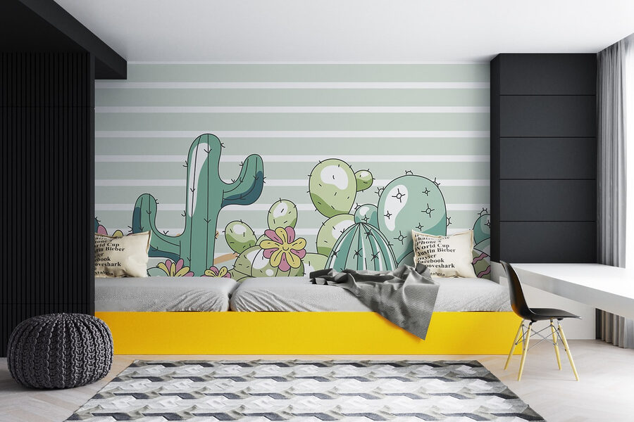 Transforme cualquier habitación en un alegre oasis con este encantador mural que presenta un animado grupo de cactus adornados con alegres flores. Imagínese entrar en un espacio donde estas extravagantes plantas aportan una sensación de calidez y diversión, como tener una pequeña fiesta en el desierto justo en su pared. Las rayas suaves y tranquilizadoras del fondo equilibran suavemente los colores vibrantes de los cactus, por lo que es perfecto para una habitación infantil o un rincón de lectura acogedor. Es como el pequeño secreto de la naturaleza, que invita a sonreír y despierta la imaginación. Imagínese a los niños acurrucados con un libro bajo este encantador mural o soñando despiertos con su próxima aventura en un jardín mágico.
