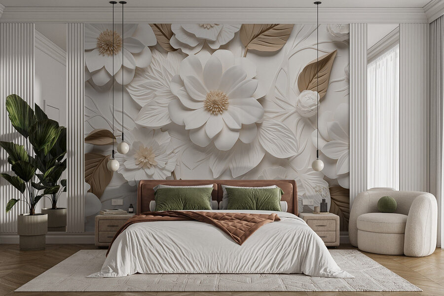 Transforme cualquier espacio con este impresionante mural de pared con flores blancas y marrones envueltas en delicadas hojas. Imagínese entrar en una habitación que se siente instantáneamente más acogedora, ¡como si la naturaleza acabara de decidir acurrucarse en sus paredes! Los tonos sutiles crean un ambiente sereno, perfecto para cualquier entorno, desde un relajante dormitorio hasta una animada sala de estar.