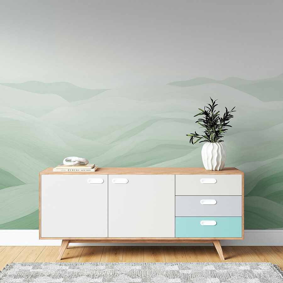 Imagine adentrarse en un paisaje sereno y de ensueño cada vez que mire a su pared. Este mural, con sus suaves tonos verdes y formas fluidas y suaves, invita a un ambiente tranquilo en cualquier habitación. Imagínatelo iluminando un rincón acogedor o sirviendo de impresionante telón de fondo para tu pequeño rincón de lectura. El sutil efecto de acuarela le da un toque de fantasía, como si fuera un jardín secreto o una mañana brumosa. Es como llevar un trozo de naturaleza al interior, perfecto para esos días en los que perseguir puestas de sol en el exterior no es una opción. Perfectamente discreto, pero ¡tan cautivador!