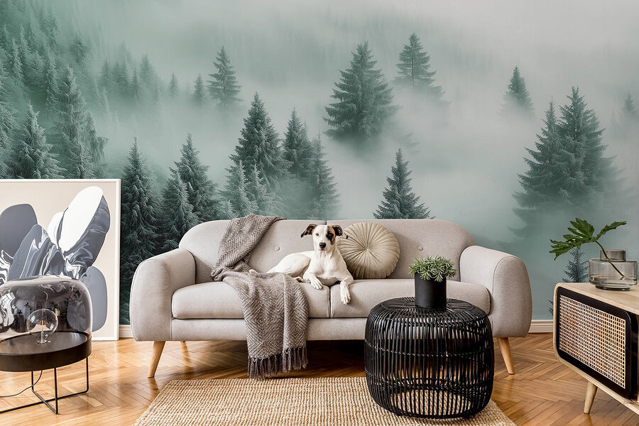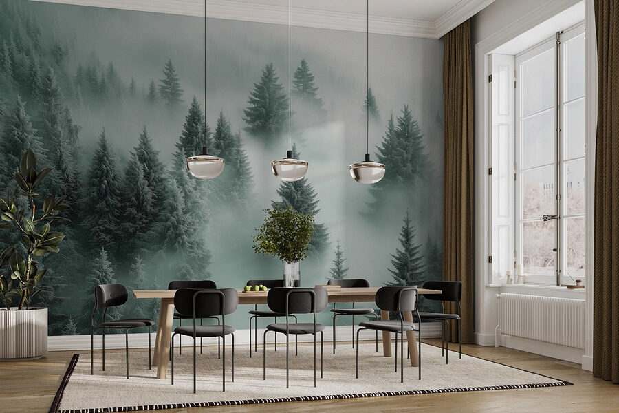 Imagínate que entras en una acogedora cabaña, cálida y acogedora, y entonces, ¡zas!, te recibe este impresionante mural de árboles en la niebla. Es como llevar la naturaleza a tu salón, pero sin el riesgo de que una ardilla se cuele en tu fiesta. Los suaves tonos verdes y las vibraciones de la niebla hacen que todo parezca tranquilo y sereno, perfecto para esos domingos de pereza o después de un largo día. Imagínate acomodándote con un buen libro, una taza de té en la mano y perdiéndote en este paisaje de ensueño. Además, es un tema de conversación: los invitados se quedarán intrigados. ¿Es un bosque mágico? ¿Un portal secreto? Usted decide. Añadir este mural es como compartir un trocito de tranquilidad con cualquiera que entre en tu espacio.