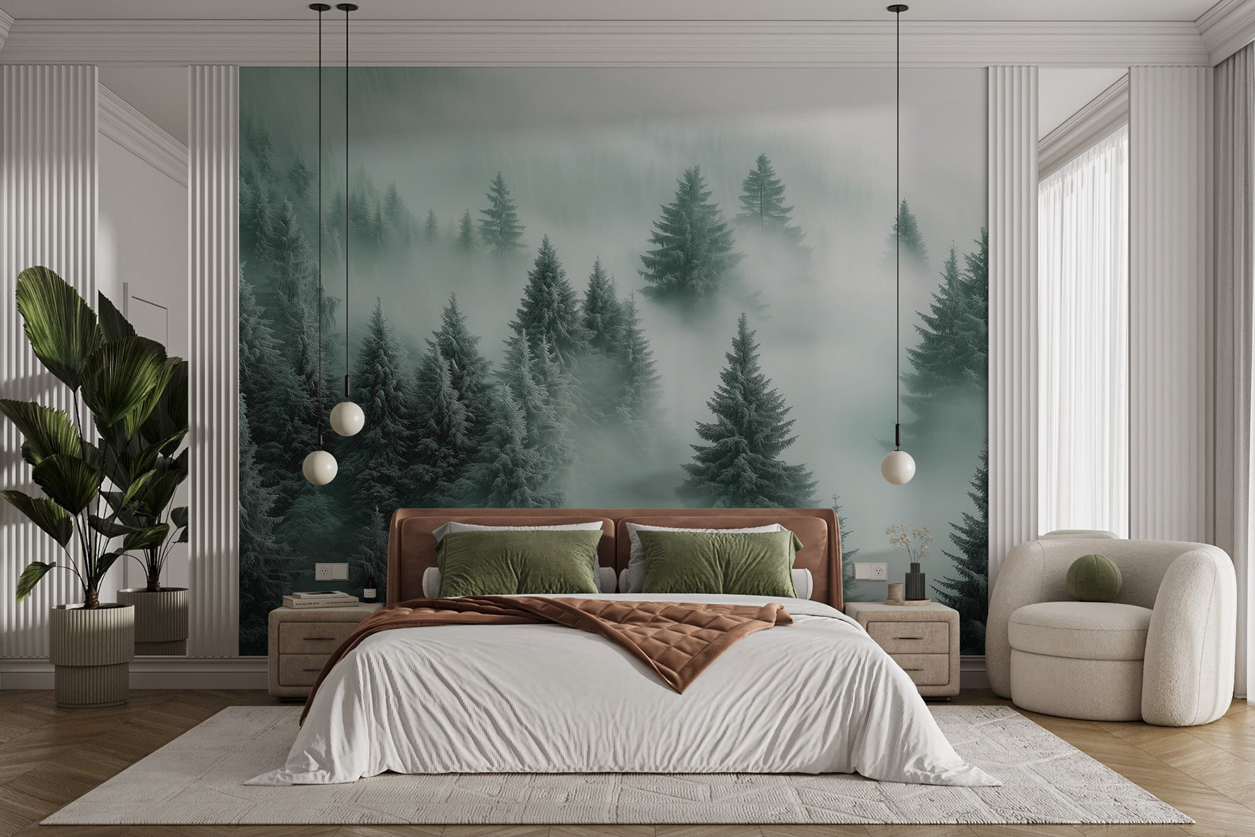 Imagínate que entras en una acogedora cabaña, cálida y acogedora, y entonces, ¡zas!, te recibe este impresionante mural de árboles en la niebla. Es como llevar la naturaleza a tu salón, pero sin el riesgo de que una ardilla se cuele en tu fiesta. Los suaves tonos verdes y las vibraciones de la niebla hacen que todo parezca tranquilo y sereno, perfecto para esos domingos de pereza o después de un largo día. Imagínate acomodándote con un buen libro, una taza de té en la mano y perdiéndote en este paisaje de ensueño. Además, es un tema de conversación: los invitados se quedarán intrigados. ¿Es un bosque mágico? ¿Un portal secreto? Usted decide. Añadir este mural es como compartir un trocito de tranquilidad con cualquiera que entre en tu espacio.