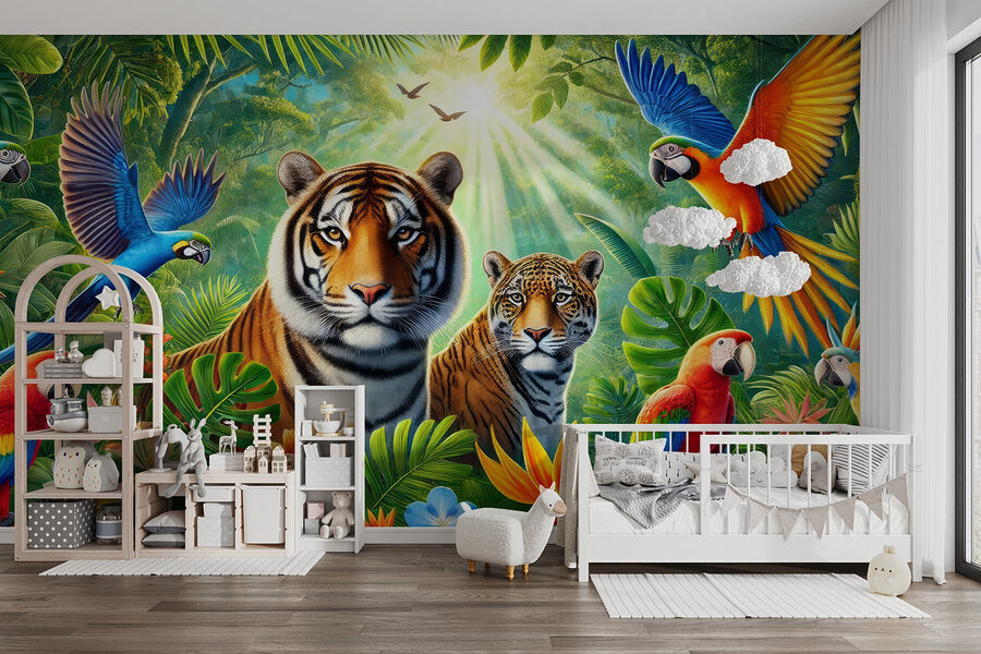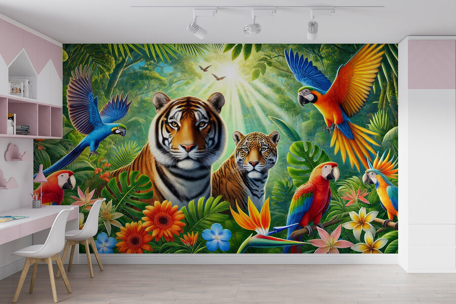 Sumérgete en el país de las maravillas de la selva con este impresionante mural de pared. Imagínese llegar a casa y encontrarse con una escena vibrante llena de vida: los tigres se relajan y los coloridos loros ofrecen un espectáculo. Es como vivir una aventura en el salón de tu casa. Casi puedes oír el susurro de las hojas y los graznidos juguetones. Coloque este mural en la pared y, de repente, su espacio parecerá un exuberante refugio, listo para unas vacaciones tropicales en cualquier momento. Perfecto para los amantes de la naturaleza o simplemente para quienes necesitan una chispa brillante en su hogar. En serio, ¿quién no sonreiría cada vez que pasara por delante? ¡Es una fiesta para los ojos!