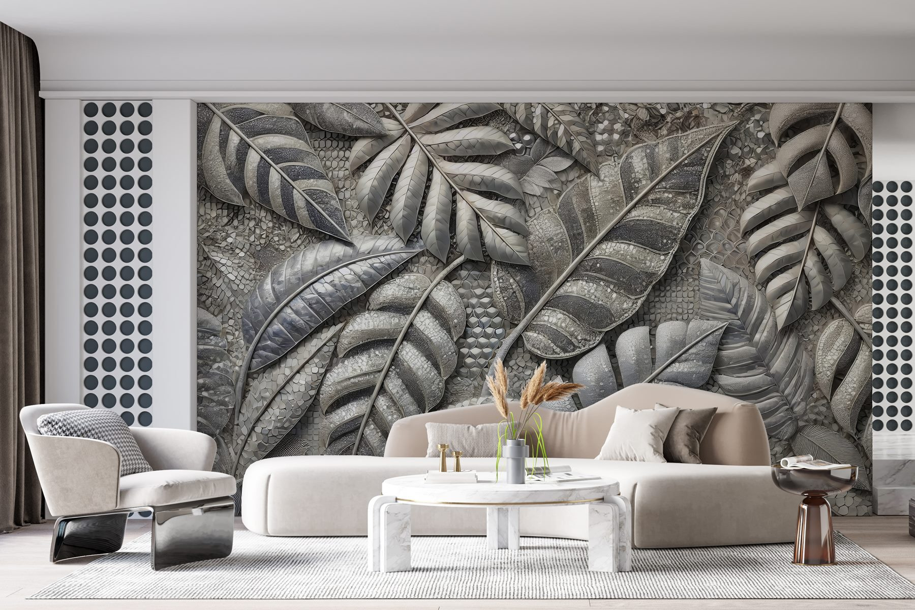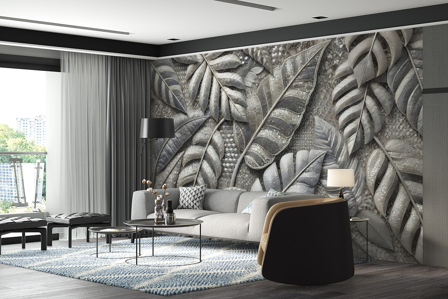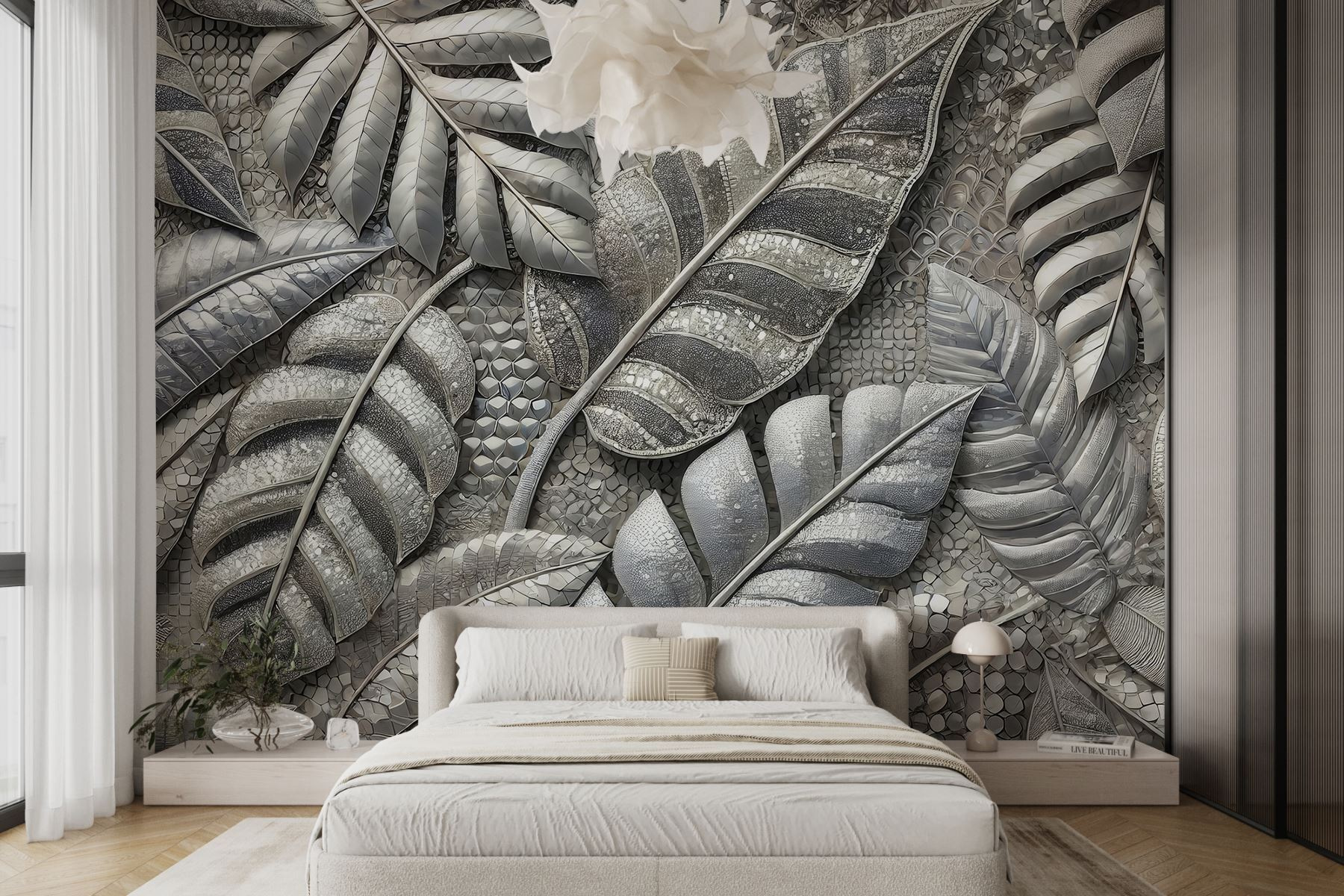 Transforma tu espacio en un refugio sereno con este mural de intrincadas hojas que te harán sentir como si estuvieras entrando en un paraíso tropical. El diseño invita a la naturaleza a entrar, haciendo que cada día sea un poco más fresco. Imagínese tomando el café de la mañana rodeado de los relajantes tonos verdes y terrosos: es como unas minivacaciones en casa. Además, el aspecto único de este mural añade un toque sofisticado sin llamar la atención. Simplemente está ahí, recordándote con estilo que la naturaleza puede ser tu mejor compañera de decoración. Perfecto para refrescar un salón o aumentar el factor acogedor de un dormitorio.