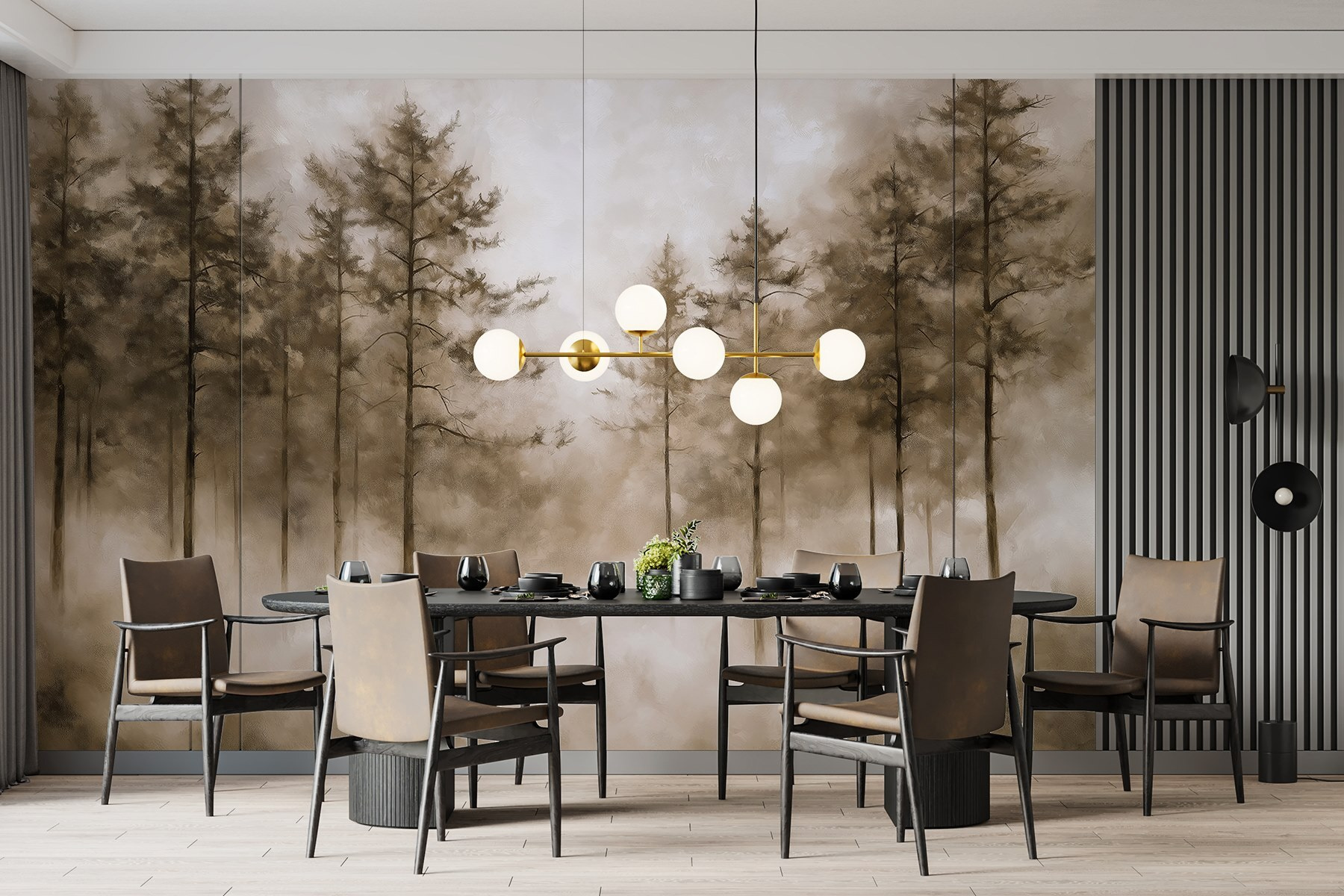 Adéntrese en una escapada de ensueño con el mural “Bosque brumoso con árboles”. Es como llevar un acogedor trozo de naturaleza al salón de tu casa, ¡sin necesidad de botas de montaña! Imagínese que se despierta, se toma un café y se siente rodeado de pinos susurrantes y una suave niebla. Los tonos suaves y apagados crean esta calma perfecta, casi como un día lluvioso favorito. Los invitados incluso podrían pensar que tienes un lado salvaje secreto. Imagínatelos perdiéndose en este ambiente sereno y tal vez compartiendo sus propias historias sobre la naturaleza. Este mural transforma cualquier espacio con un toque de magia y una pizca de fantasía, ¡perfecto para quienes buscan un soplo de aire fresco en el interior!