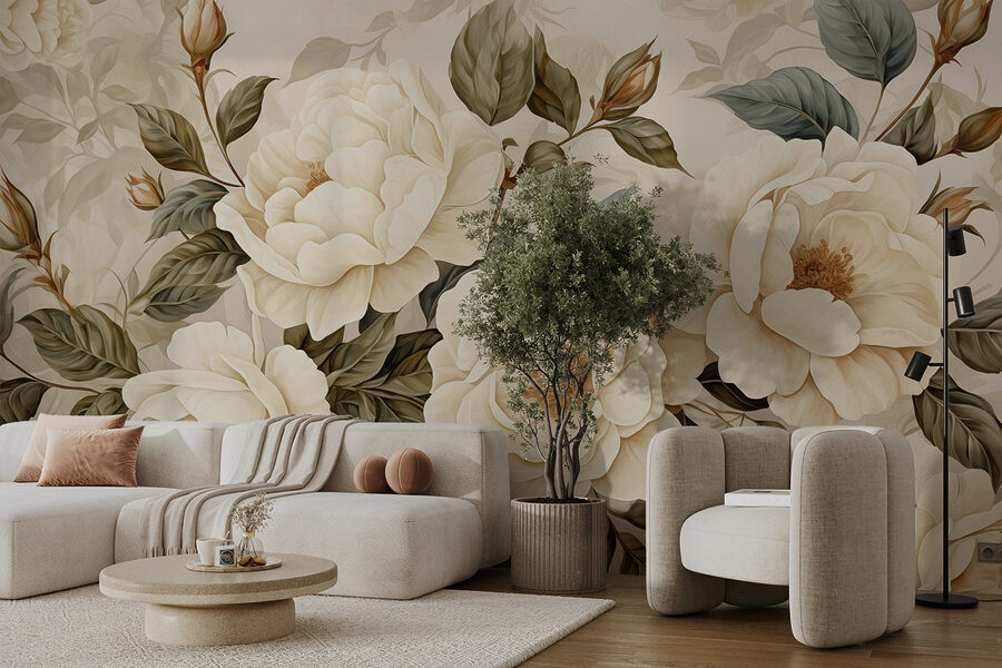 Transformar una habitación en un acogedor oasis es muy fácil con “Delicate Blooms in Soft Tones”. Imagina que entras en un espacio en el que las cremosas peonías florecen sin esfuerzo en las paredes, envolviéndote en suaves tonos casi de ensueño. Es como tener tu propio jardín, sin las molestas abejas. Perfecto para esos días en los que sólo quieres tomar el té, acurrucarte con un buen libro o soñar despierto con picnics primaverales.