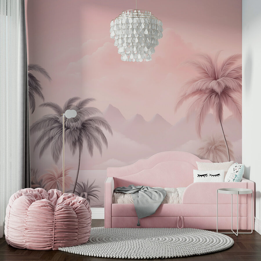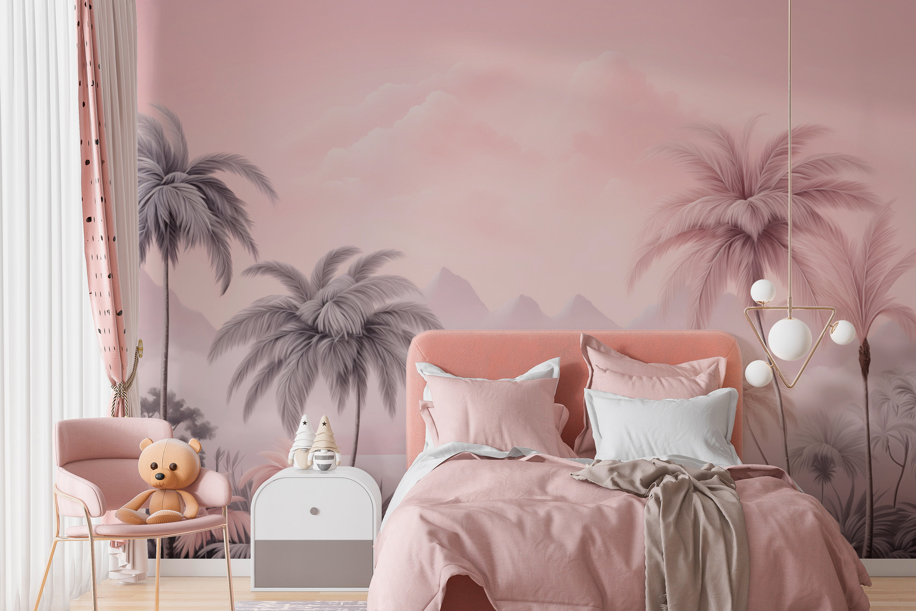 Transforme su espacio en una escapada tranquila con este impresionante mural de pared con exuberantes palmeras y serenas montañas. Imagínese tomando su bebida favorita mientras los suaves tonos rosas y grises le envuelven, haciendo que cada día se sienta como si estuviera de vacaciones. Es perfecto para crear un ambiente relajado, ya sea en el salón o en ese acogedor rincón de lectura que te gustaría tener. ¿La forma en que las montañas se asoman entre las palmeras? Pura magia. Es como la naturaleza llevada al interior, calmando el alma mirada a mirada. Además, es lo suficientemente atrevido como para iniciar una conversación, ¿quién no lo admiraría?