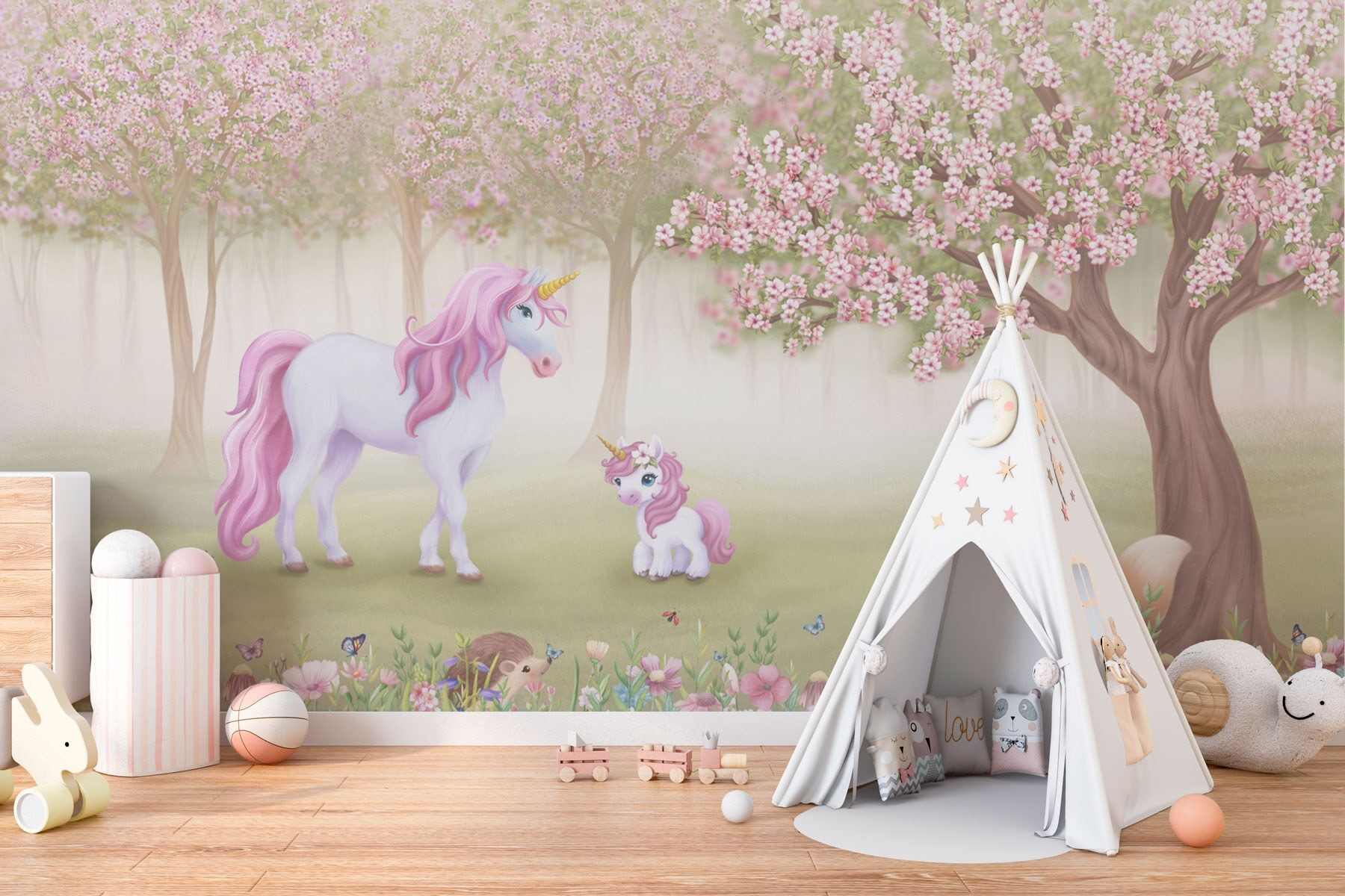 Transforma cualquier habitación en un caprichoso país de las maravillas con este encantador mural protagonizado por un unicornio y sus peludos amigos. Imagina las delicadas flores rosas meciéndose suavemente, llenando el aire de dulzura – perfecto para encender la alegría cada día. El dúo de unicornios y adorables criaturas del bosque invita a una energía suave y juguetona a la que es difícil resistirse. Imagina tardes acogedoras leyendo o soñando despierto, con la belleza de la naturaleza a sólo un vistazo de distancia. Este mural no sólo decora, sino que cuenta una historia, aportando calidez y una pizca de magia a las paredes a las que les vendría bien un poco de alegría. Perfecto para espacios infantiles o para cualquier persona joven de corazón.