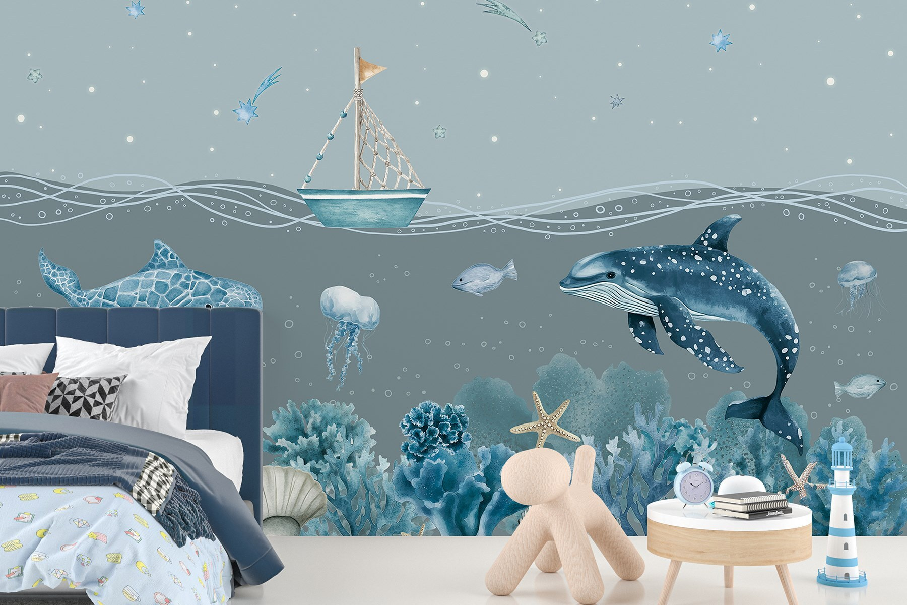 Transforme su espacio en una serena escapada submarina con el mural de pared “Sea Life”. Imagine despertarse cada día con los juguetones delfines y las suaves medusas bailando por sus paredes. Esta escena de ensueño captura un encantador barquito deslizándose por un mar tranquilo, rodeado de vibrantes corales y estrellas de mar. Es como tener un trocito del océano en casa, ¡sin el pelo salado! Perfecto para la habitación de un niño o incluso para un acogedor rincón de lectura, este mural aporta un toque de capricho y calma. Deja que los colores te inunden, creando un ambiente tranquilo que podría inspirarte a soñar despierto con aventuras en el océano.