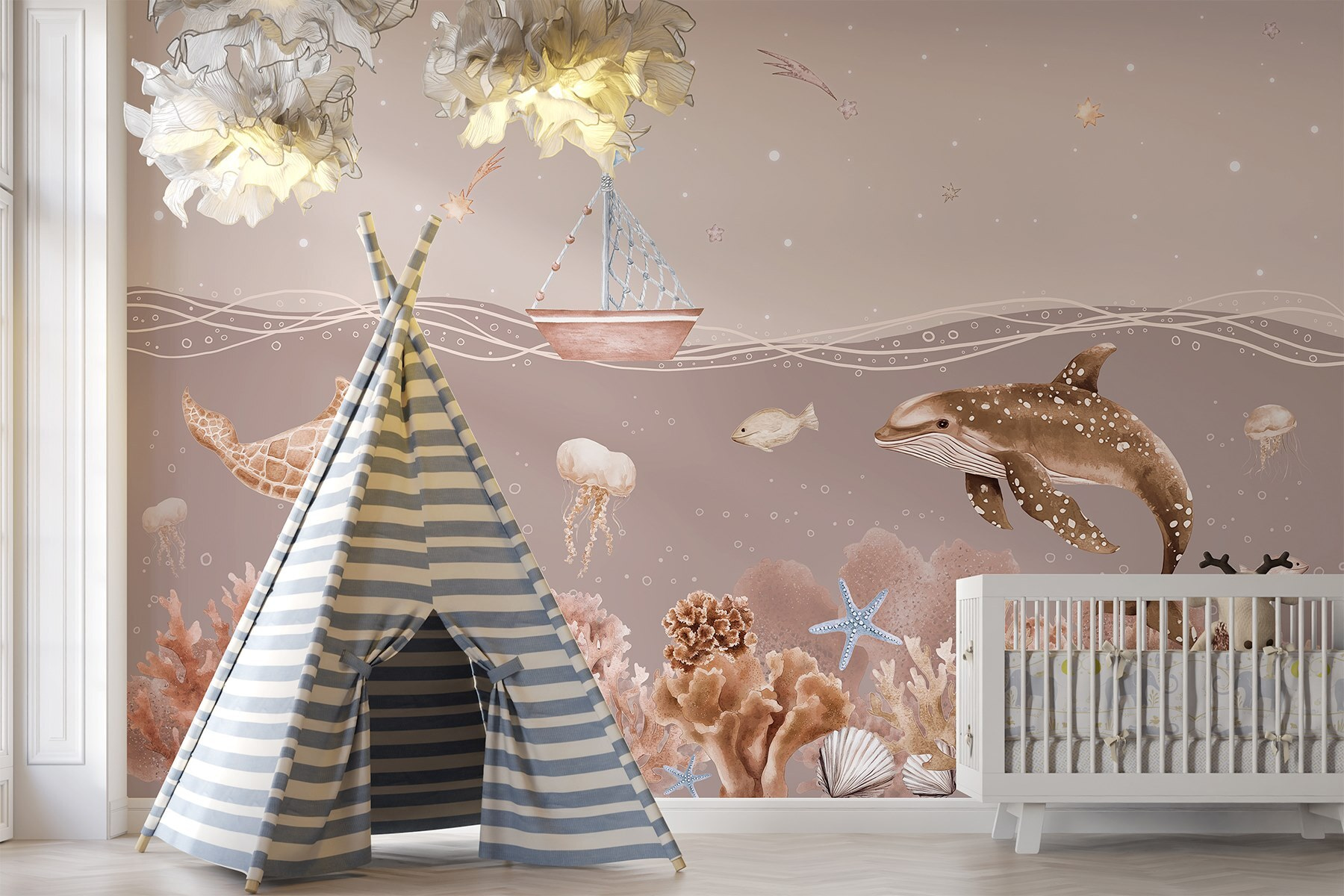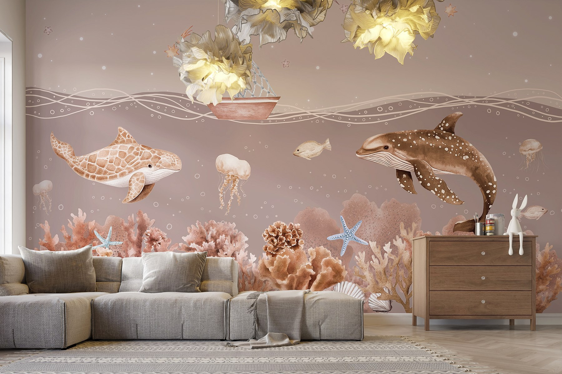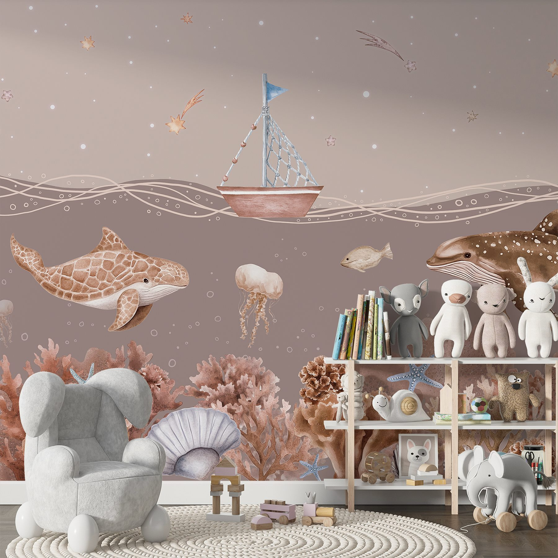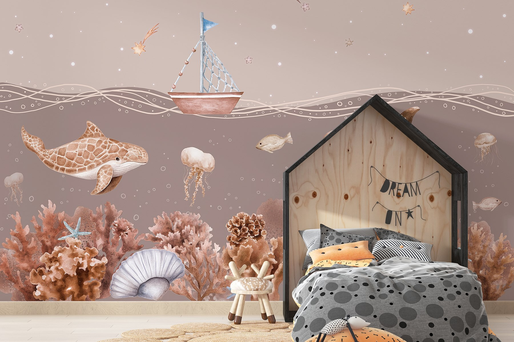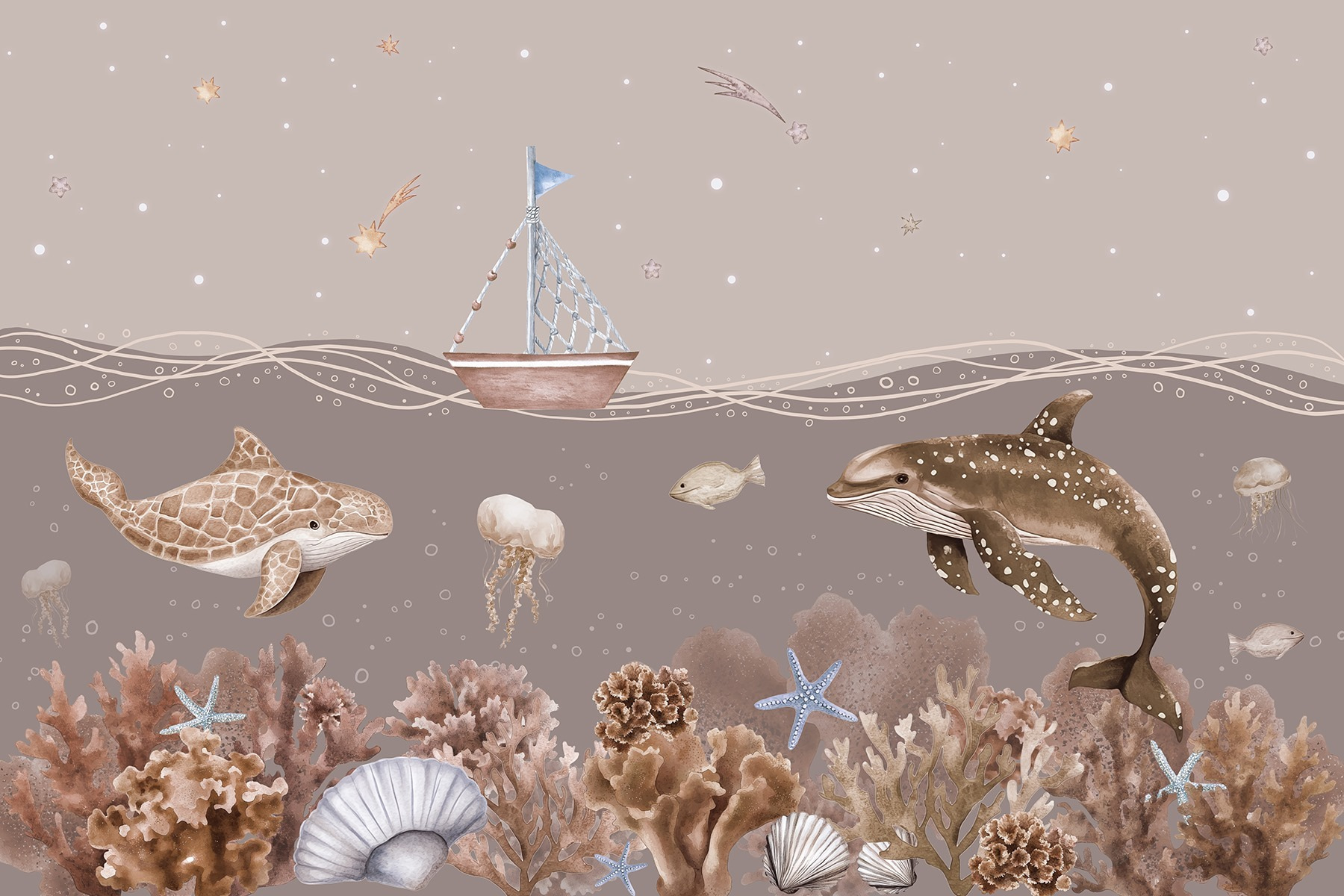 Sumérgete en un mundo de fantasía con este impresionante mural de pared, “Vida marina con un barco y peces”. Imagínatelo: un apacible velero balanceándose sobre una juguetona vida marina que parece casi real. Es como vivir una aventura submarina secreta en el salón de tu casa. Imagina a los niños (¡o a los adultos!) soñando con historias submarinas mientras contemplan la tortuga, las medusas y el vibrante coral. Este mural aporta un ambiente tranquilo y costero a cualquier espacio y añade un toque de alegría. Perfecto para hogares, guarderías o cualquier lugar donde se necesite un toque de magia oceánica. ¿Quién no sonreiría ante esta alegre escena?