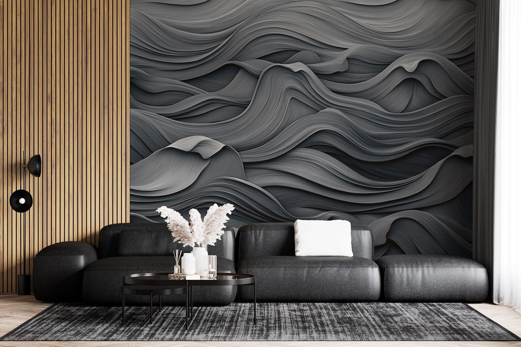 Transforme su espacio con este precioso mural de pared ondulado en gris y blanco. Es como un suave baile de olas, añadiendo un ambiente sereno que hace que cualquier habitación parezca más acogedora. Imagine su salón o dormitorio envuelto en estas líneas suaves y ondulantes, de repente, es como si sus paredes le susurraran secretos tranquilos. Perfecto para esas noches acogedoras o incluso para un animado brunch con amigos, es un tema de conversación sin ni siquiera intentarlo. Además, ¿a quién no le gusta un poco de textura? No es sólo decoración, es una experiencia, que convierte esas paredes anodinas en un lienzo de sutil sofisticación. ¡Sumérgete!