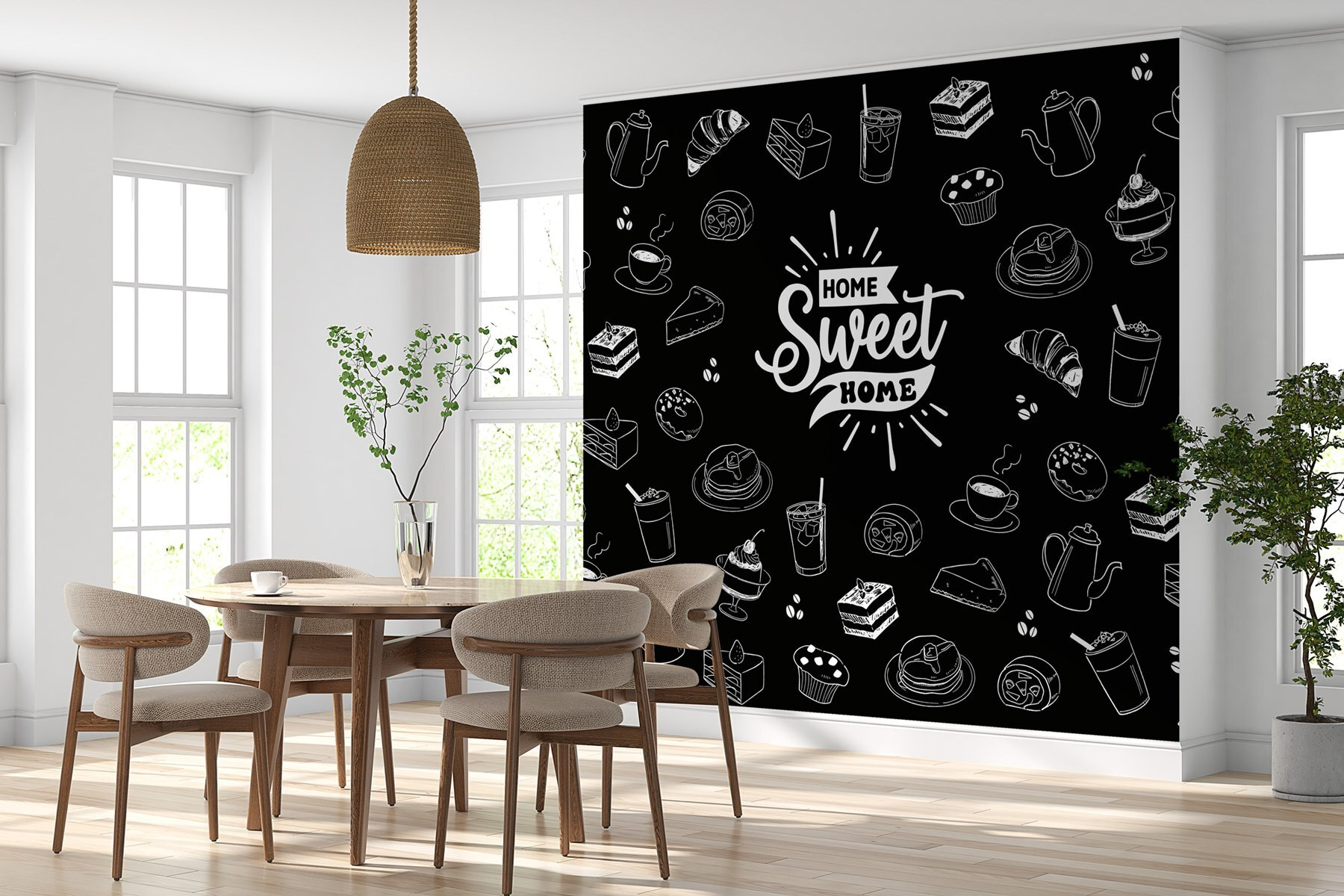 Transforme su espacio con este encantador mural de pared en blanco y negro, con una encantadora variedad de ilustraciones de comida. Imagínese acurrucado en su cocina, rodeado de juguetones bocetos de magdalenas, tazas de café y pasteles. Es como una pequeña y acogedora cafetería en tu pared, invitándote a darte un capricho. Además, el eslogan “Hogar, dulce hogar” añade un toque reconfortante, porque ¿a quién no le gusta que le recuerden su lugar feliz? Perfecto para los que aprecian un buen tentempié y una buena carcajada, este mural aporta un ambiente caprichoso que disfrutarás cada día. ¡Es una decoración que habla deliciosamente!