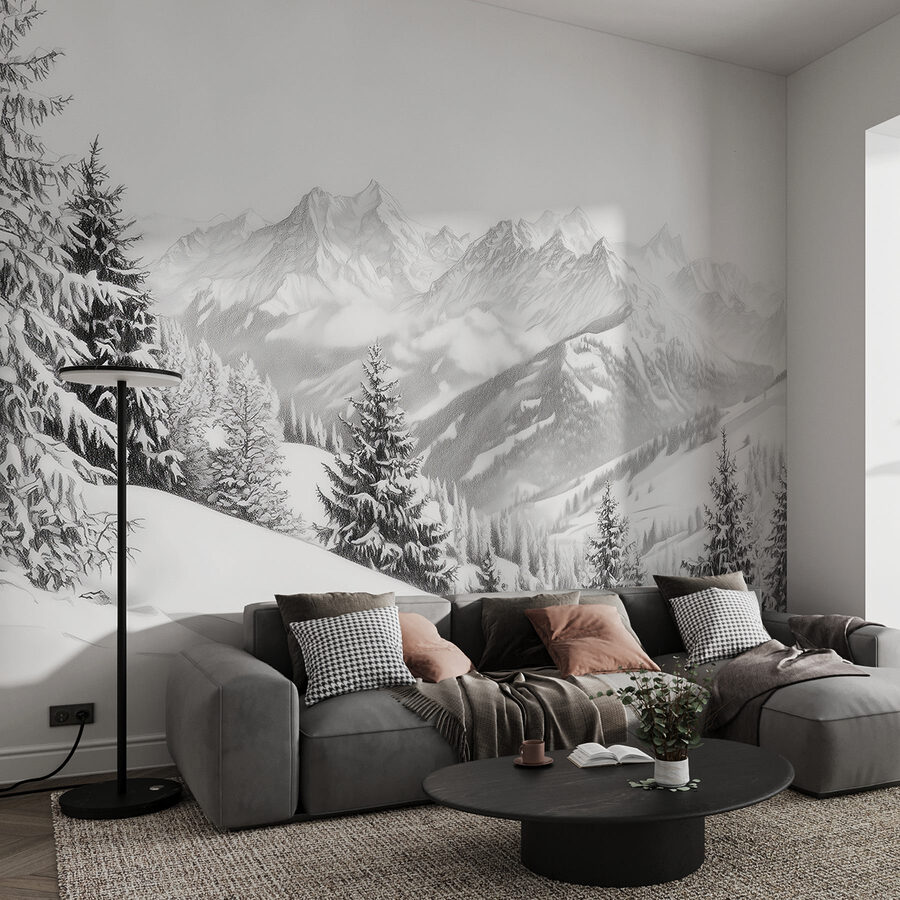 Transforma cualquier habitación en una serena escapada invernal con este impresionante mural de montañas nevadas y árboles majestuosos. Imagínate acurrucado con una bebida caliente, contemplando el impresionante paisaje que se siente a un suspiro de distancia. Los blancos tranquilos y los grises suaves evocan una calma que envuelve como una manta cálida, perfecta para esas noches frías. Añade un toque salvaje a tus paredes y deja que tu espacio respire aire fresco de montaña. Ideal tanto para los amantes de la naturaleza como para los que sueñan despiertos, este mural invita a la paz y a la aventura, incluso desde el sofá.