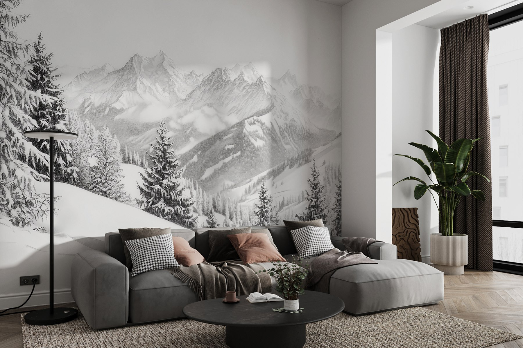 Transforma cualquier habitación en una serena escapada invernal con este impresionante mural de montañas nevadas y árboles majestuosos. Imagínate acurrucado con una bebida caliente, contemplando el impresionante paisaje que se siente a un suspiro de distancia. Los blancos tranquilos y los grises suaves evocan una calma que envuelve como una manta cálida, perfecta para esas noches frías. Añade un toque salvaje a tus paredes y deja que tu espacio respire aire fresco de montaña. Ideal tanto para los amantes de la naturaleza como para los que sueñan despiertos, este mural invita a la paz y a la aventura, incluso desde el sofá.
