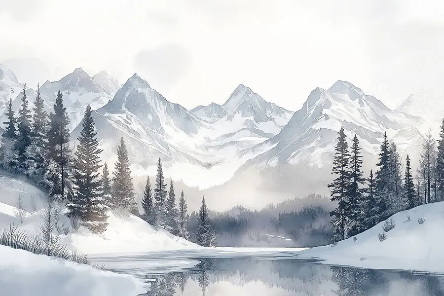 Fotomurales Lago rodeado de nieve y montañas (SKU: w02357)
