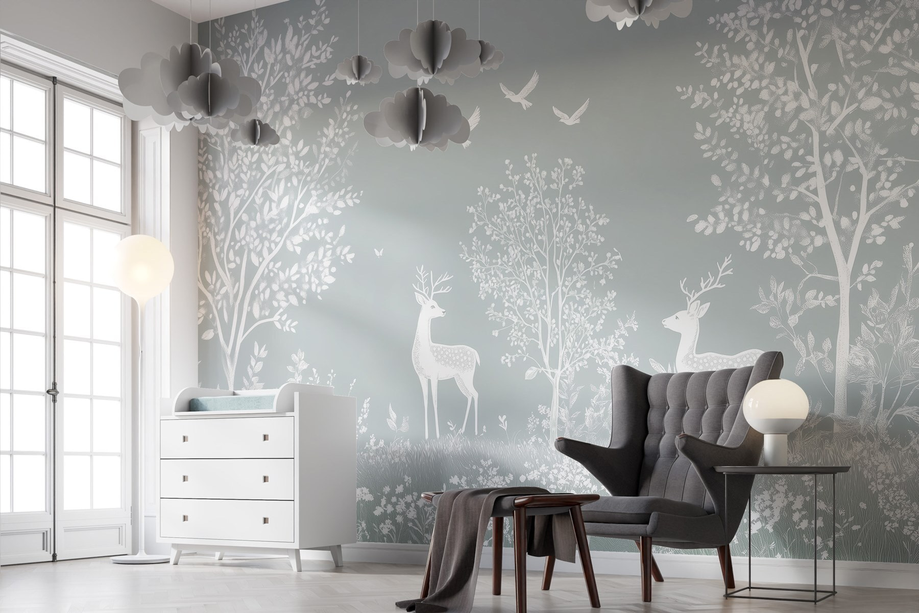 Transforme su espacio en una escapada serena con este encantador mural de pared que muestra gráciles ciervos blancos deambulando por un bosque suave y frondoso. Imagina que entras en tu habitación y te sientes como si hubieras entrado en un bosque de ensueño lleno de suaves susurros de la naturaleza. Los delicados pájaros que revolotean por encima añaden un toque de fantasía, convirtiéndolo en el telón de fondo perfecto para veladas acogedoras o mañanas inspiradoras. Es como tener un refugio de paz en casa. Ya sea tomando el té o leyendo un libro, este mural invita a esos dulces momentos de calma. Además, es un gran tema de conversación: ¿a quién no le gustaría charlar sobre su bosque secreto?