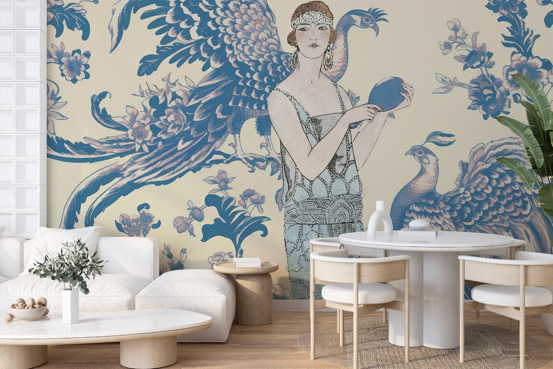 Eleve su espacio con este impresionante mural en el que aparece una elegante mujer sosteniendo un objeto redondo azul, rodeada de caprichosos pavos reales y delicadas flores. Es como tener una obra de arte de ensueño en la pared. Imagínese despertarse cada día con este toque de color y elegancia, perfecto para crear un ambiente sereno. Ya sea en un rincón acogedor o en un elegante salón, este mural le invita a un mundo de belleza. Los invitados no podrán resistirse a admirarlo, y puede que inspire una conversación espontánea sobre arte, viajes o los escurridizos pavos reales, porque ¿a quién no le gusta un poco de glamour?