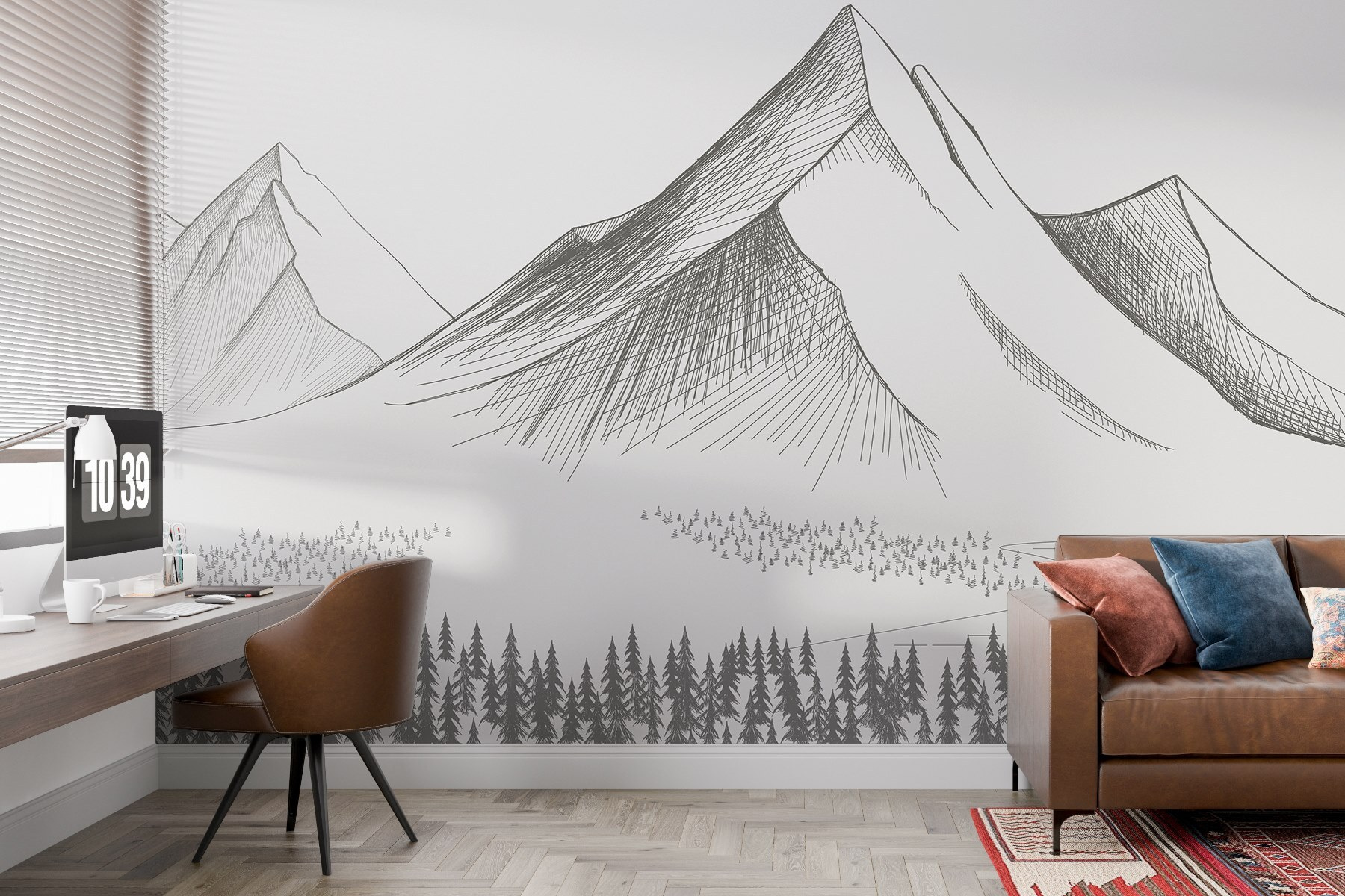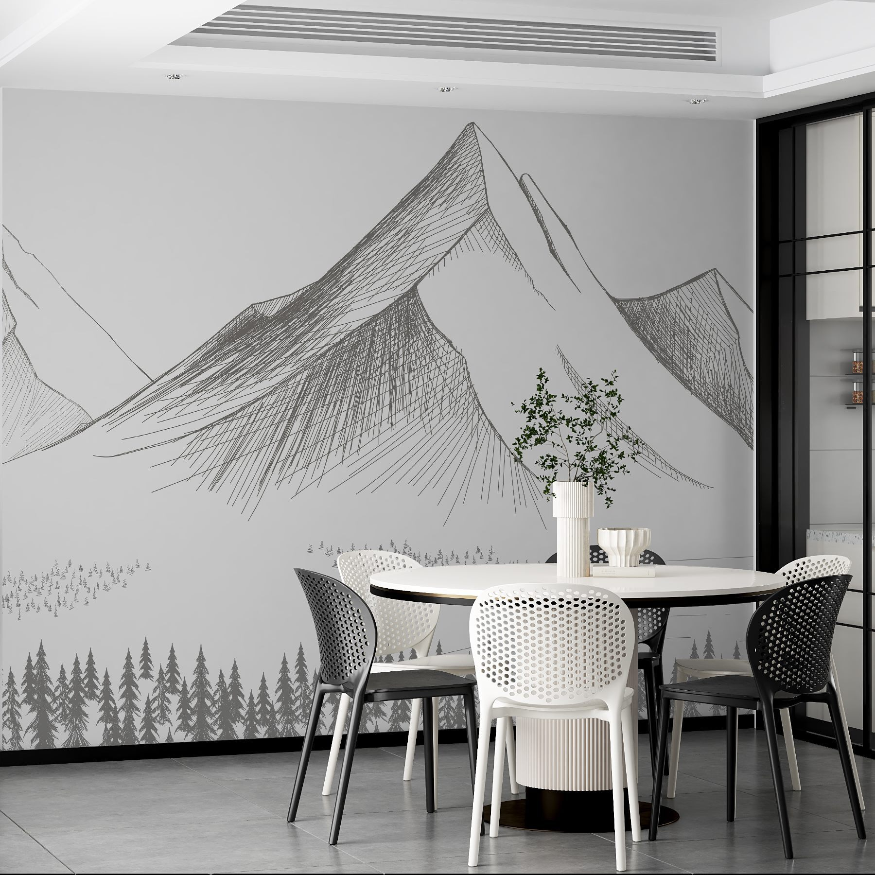 Transforme su espacio con este impresionante mural de pared de una cadena montañosa, donde los árboles se mecen con una suave brisa, invitando a un trozo de naturaleza en el interior. Imagínese tomando un café mientras contempla los majestuosos picos que parecen susurrar historias de aventuras. Las líneas sutiles y los tonos tierra crean un ambiente relajante, perfecto para desconectar después de un largo día o despertar la creatividad en un fin de semana de ocio. Además, es como un acogedor refugio en una cabaña sin tener que quitar la nieve. Deje que este mural sea el telón de fondo de reuniones memorables o momentos tranquilos. ¿A quién no le gustaría tener esa serena escapada a la montaña en casa?
