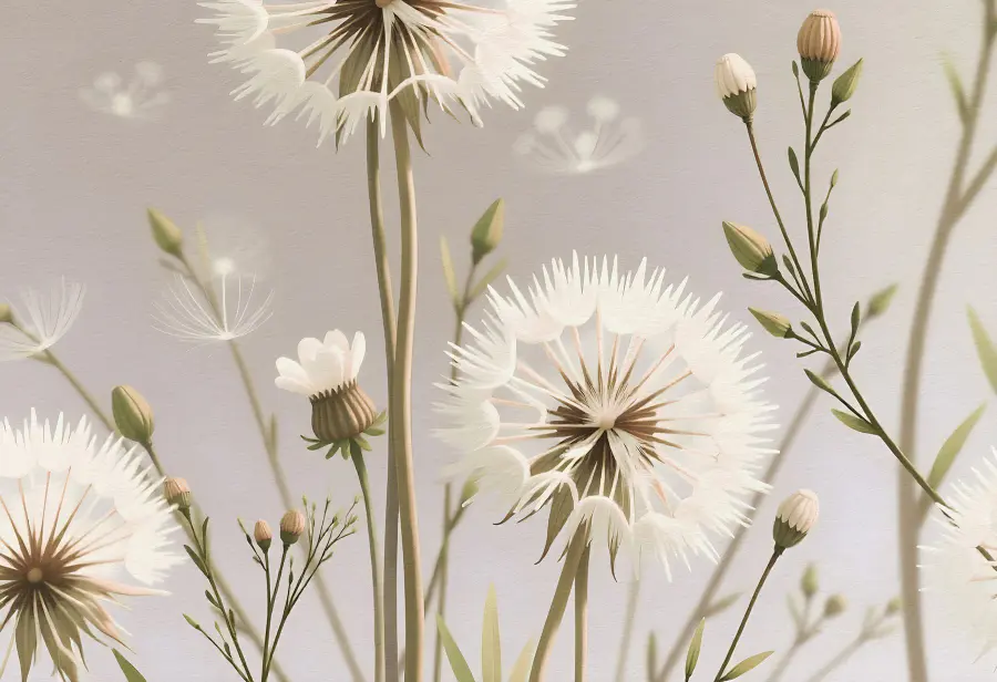 Transforme su espacio con el mural “Delicate Blooms in Soft Palette”. Este bello diseño aporta un toque de naturaleza al interior, con encantadores dientes de león y suaves flores. Imagine despertarse y ser recibido por esta relajante obra de arte, ¡es como un suave susurro del jardín!
