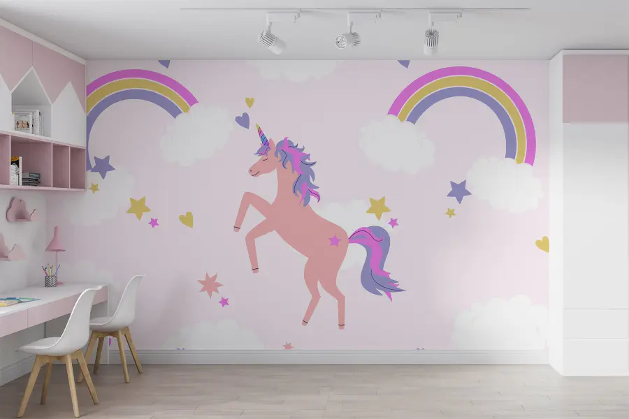 Transforma cualquier espacio en un caprichoso país de las maravillas con este encantador mural de pared que muestra un encantador unicornio bailando entre arco iris y esponjosas nubes. Imagina que entras en una habitación llena de magia: cada mirada revela colores de ensueño y encantadoras estrellas que te arrancan una sonrisa. Perfecto para una habitación infantil o una sala de estar juguetona, este mural invita a todos a abrazar a su niño interior. Es como tener un cuento de hadas en la pared, que despierta la alegría y la imaginación cada día. ¿Quién no querría una fiesta de unicornios cada vez que pasea? ¡Déjate llevar por la fantasía!