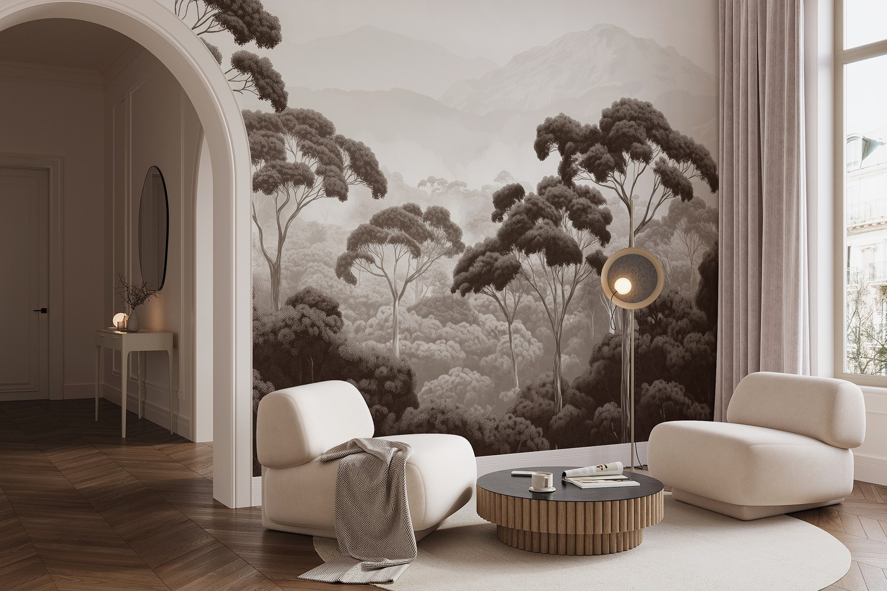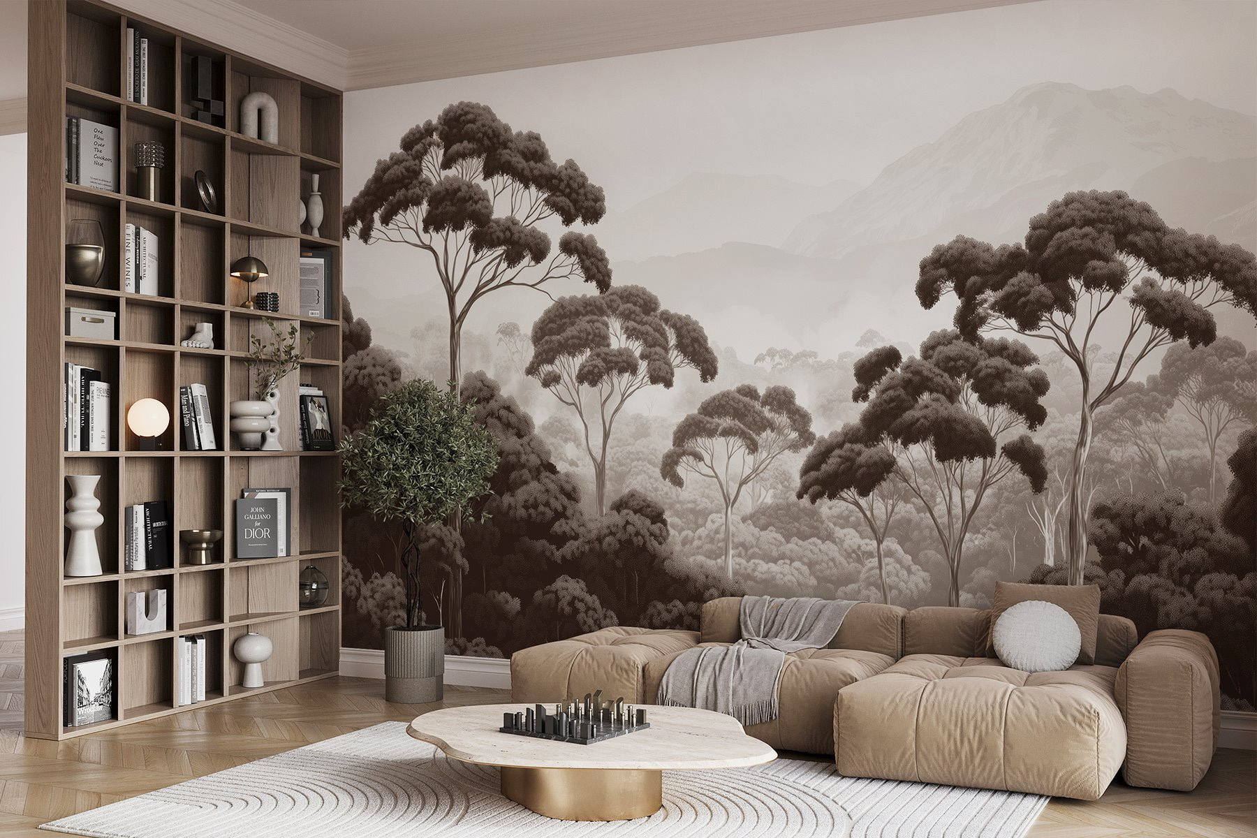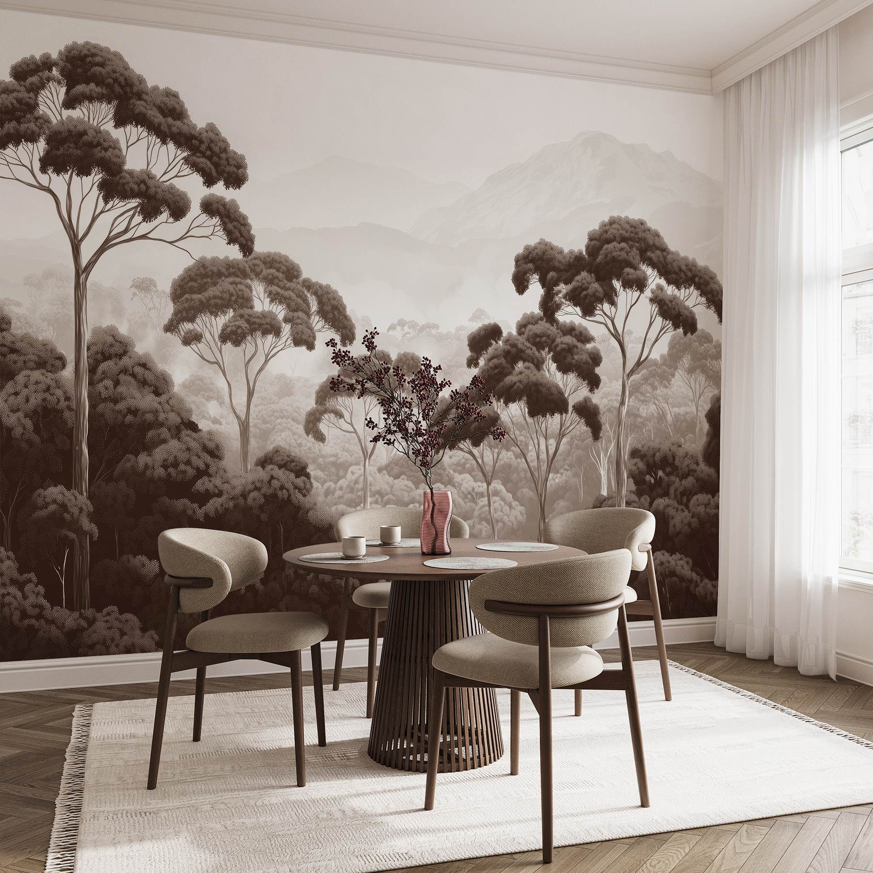 Transforme cualquier habitación en una escapada serena con este impresionante mural de pared que presenta una tranquila escena forestal: piense en árboles imponentes y majestuosas montañas de fondo. Imagínese despertarse con esta relajante vista cada día, como si la propia naturaleza se hubiera trasladado a su hogar. Los tonos suaves y terrosos evocan una sensación de paz, perfecta para descansar o incluso para añadir un ambiente acogedor durante esos maratones de Netflix. Es como llevar un poco de la naturaleza al interior, pero sin bichos ni zapatos embarrados. ¿Te apetece soñar despierto? Recuéstate y deja que tus ojos vaguen por este paisaje de ensueño. Perfecto para cualquier espacio, este mural hace que cada pared parezca un lugar de escapada.