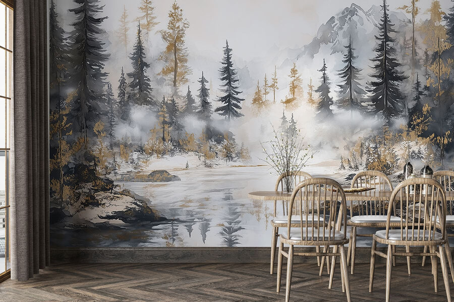 Transforme su espacio en una escapada serena con este impresionante mural de acuarela de un bosque y montañas. Es como llevar la calma de la naturaleza al interior, sin las picaduras de insectos y los zapatos embarrados. Imagínese acogedoras tardes junto al “fuego” (o simplemente con una vela parpadeante) mientras contempla esos árboles neblinosos y los imponentes picos: ¿quién necesita unas botas de montaña cuando tiene esta belleza en la pared? Perfecto para un salón o un tranquilo rincón de lectura, este mural susurra relajación. Es un ingenioso recordatorio para respirar hondo y dejar que la naturaleza haga su magia, justo en tu casa.
