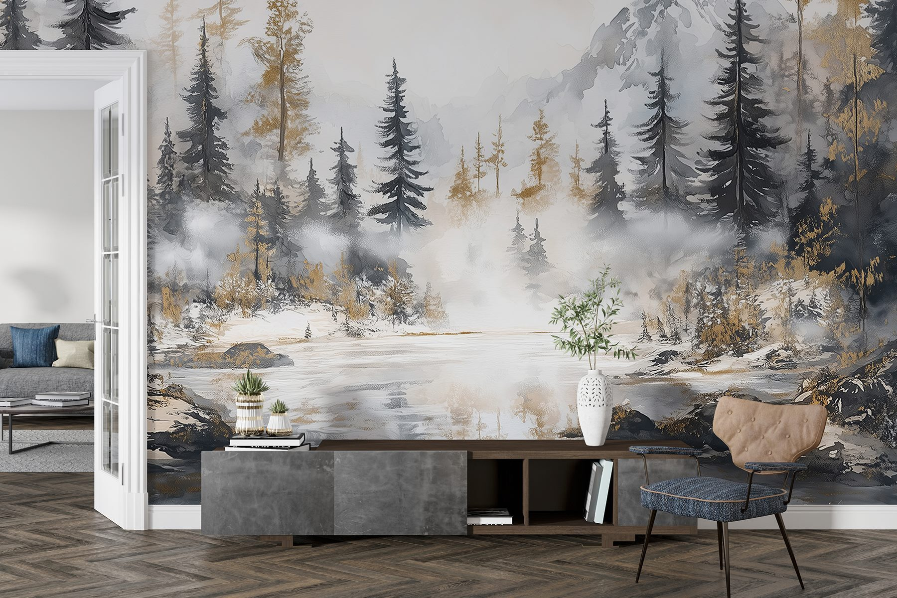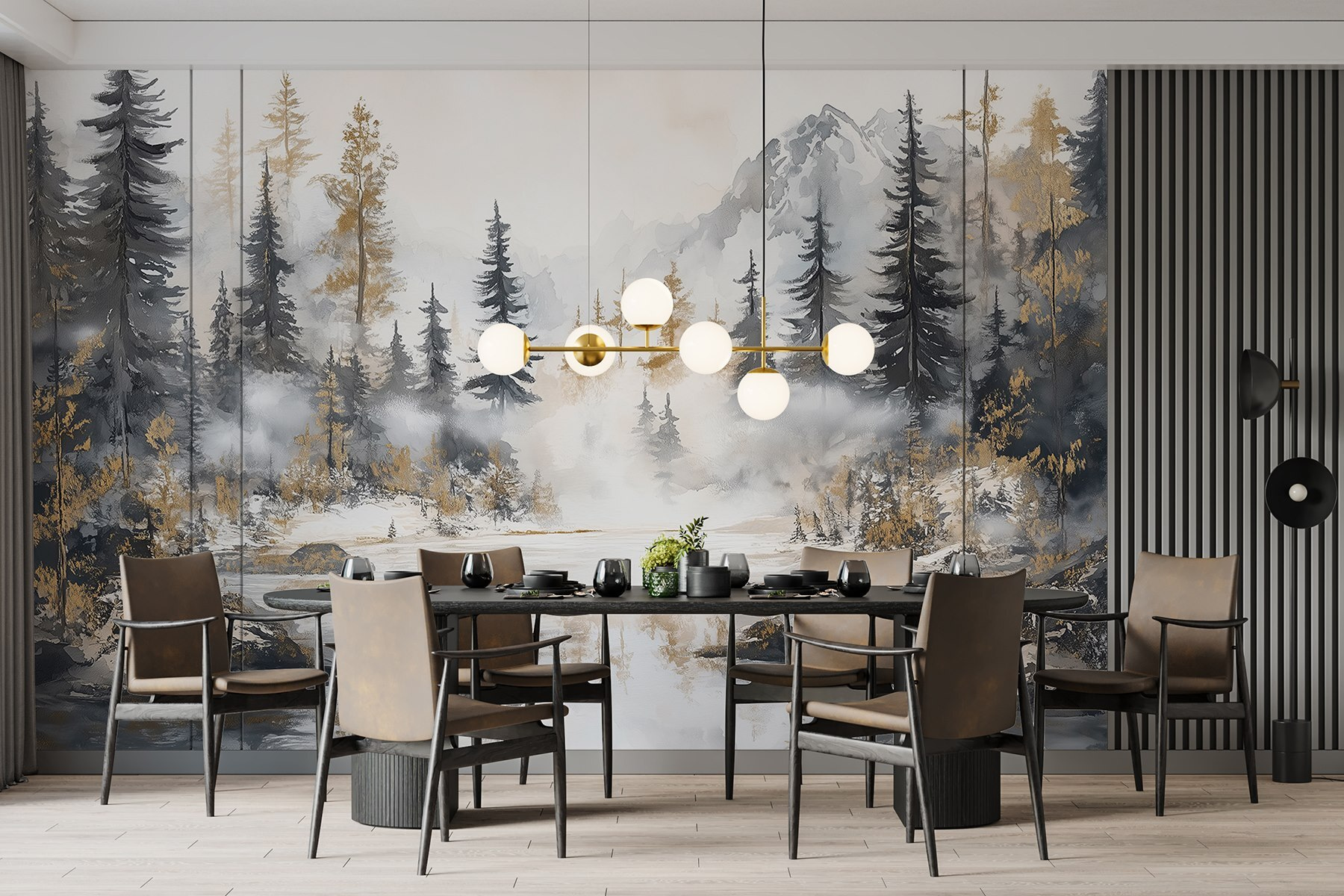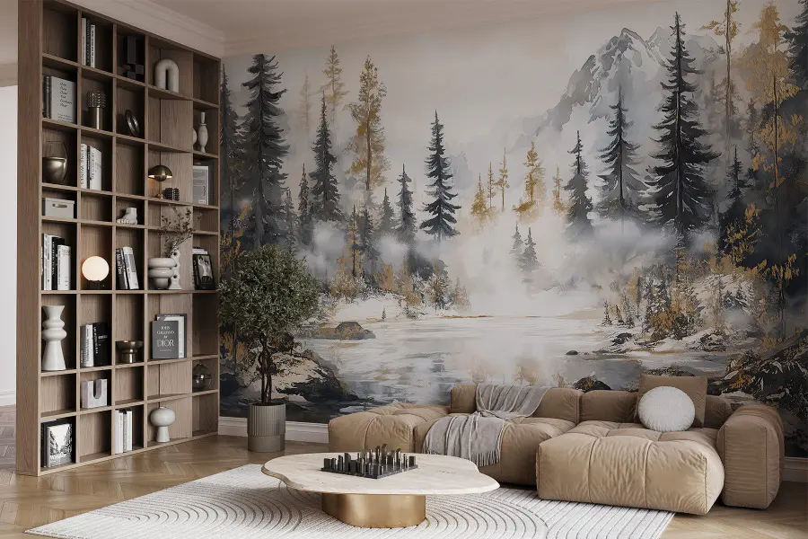 Transforme su espacio en una escapada serena con este impresionante mural de acuarela de un bosque y montañas. Es como llevar la calma de la naturaleza al interior, sin las picaduras de insectos y los zapatos embarrados. Imagínese acogedoras tardes junto al “fuego” (o simplemente con una vela parpadeante) mientras contempla esos árboles neblinosos y los imponentes picos: ¿quién necesita unas botas de montaña cuando tiene esta belleza en la pared? Perfecto para un salón o un tranquilo rincón de lectura, este mural susurra relajación. Es un ingenioso recordatorio para respirar hondo y dejar que la naturaleza haga su magia, justo en tu casa.