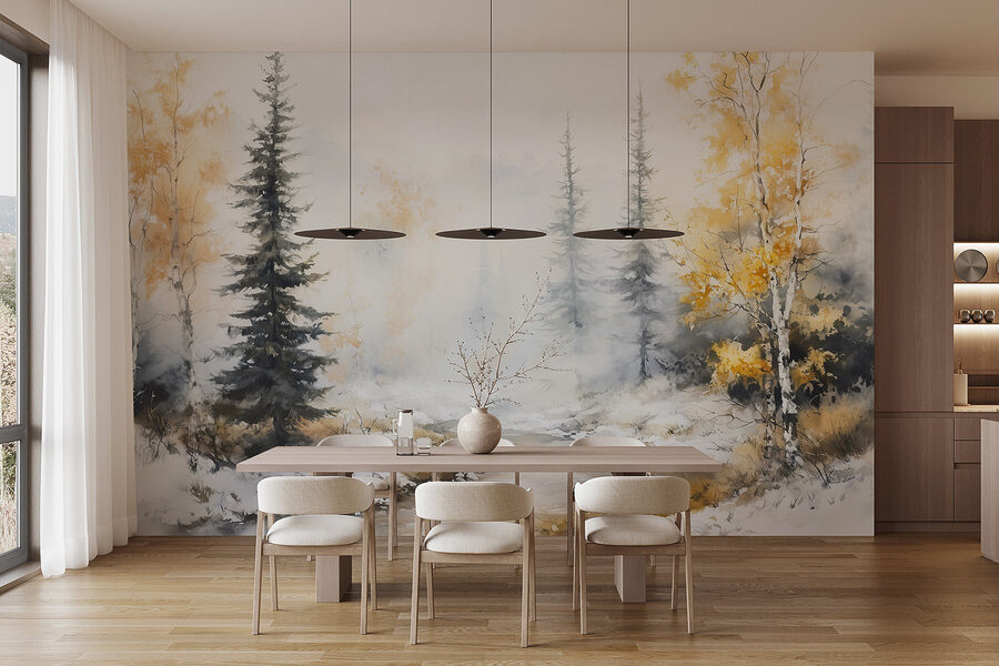 Transforme cualquier habitación con este impresionante mural de acuarela, que muestra un sereno río serpenteando a través de un paisaje nevado. Imagine entrar en su espacio y ser recibido por suaves susurros de la naturaleza, donde los altos árboles bailan con la suave brisa. Los tonos brumosos crean un ambiente relajante, perfecto para reuniones acogedoras o momentos tranquilos con un buen libro. Imagina una taza de té en la mano, la calidez de tu hogar contrastando con el frío exterior. Es algo más que decoración: es como trasladar un refugio de paz al interior. Pero cuidado, tus amigos podrían preguntarte si te has mudado a una cabaña en el bosque.
