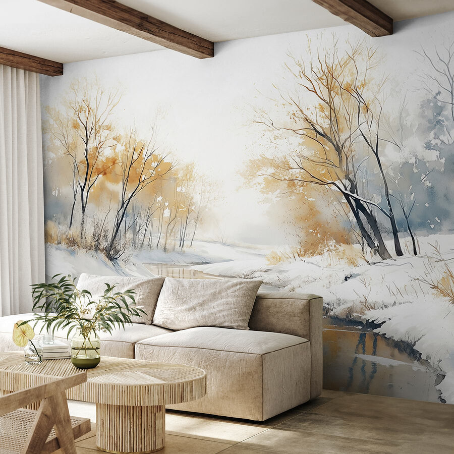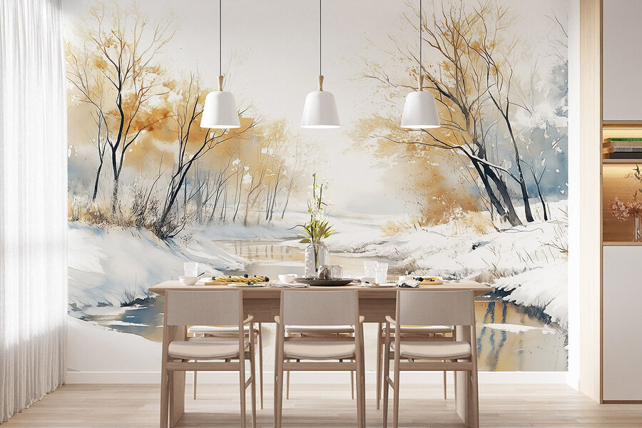 Imagínese entrar en un país de las maravillas nevado cada vez que entre en su habitación. Este mural “Río con nieve y árboles” captura ese ambiente sereno como una manta acogedora en un día frío. Los tonos suaves de la acuarela se mezclan suavemente, creando una escena pacífica del río enmarcada por los árboles delicados, todos espolvoreados en una capa de nieve.