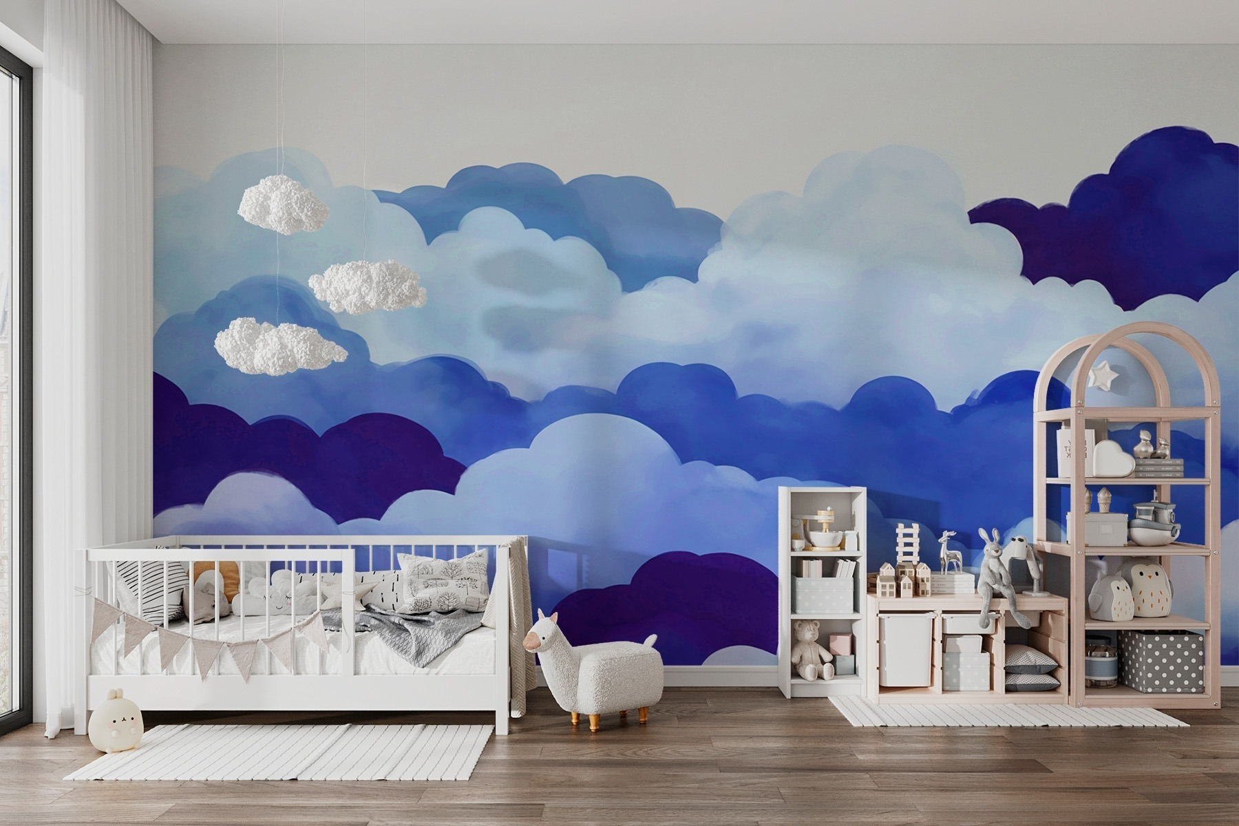 Transforme su espacio en una escapada de ensueño con este impresionante mural de nubes bailando en el cielo. Imagínese despertarse con azules suaves y blancos apacibles, como un abrazo acogedor de la propia naturaleza. Es el telón de fondo perfecto para un rincón de lectura relajante o un dormitorio sereno. Imagínese tomando un café, contemplando esas nubes infinitas, tal vez incluso soñando despierto sobre dónde podrían estar flotando. El efecto de acuarela aporta un toque artístico que es a la vez calmante e inspirador. Este mural invita a hacer una pausa, respirar hondo y sentirse animado cada día. No es una mala manera de alegrar cualquier pared, ¿verdad?