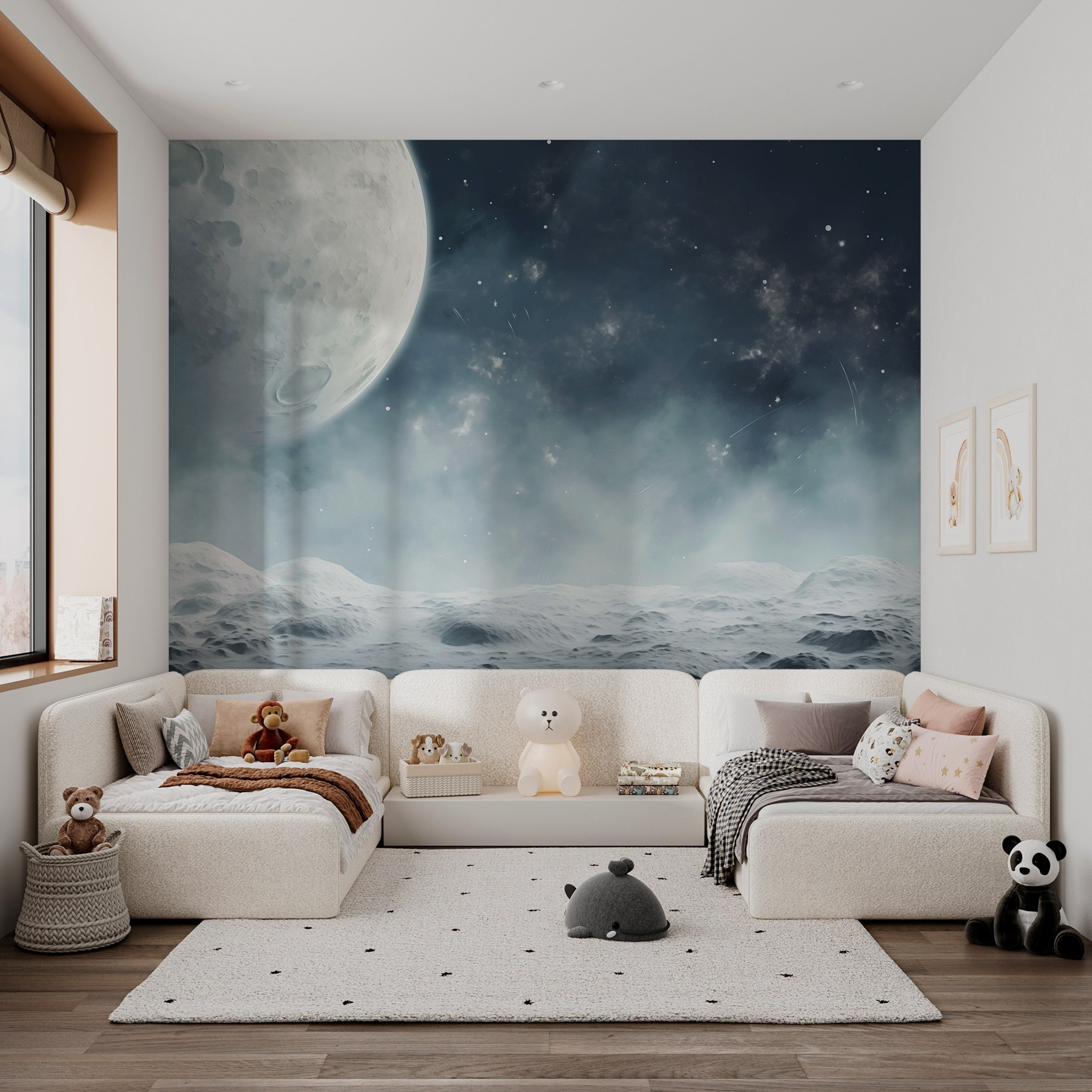 Transforma cualquier habitación en una escapada de ensueño con los “Murales de pared Luna en el cielo”. Imagina contemplar una enorme luna rodeada de suaves nubes y centelleantes estrellas. Es el tipo de mural que te hace hacer una pausa, tomar aliento y sentir un poco de asombro. Perfecto para un rincón de lectura acogedor o un dormitorio relajante, este mural captura ese ambiente sereno del cielo nocturno sin esfuerzo. Una mirada y será como transportarse a una noche estrellada. También es un tema de conversación: los amigos podrían preguntarte si tienes un telescopio escondido. Así que, tanto si se trata de una noche de cine como de una velada tranquila, este mural añade un toque de magia a las paredes corrientes. ¿A quién no le gustaría tener un poco de luz de luna en casa?