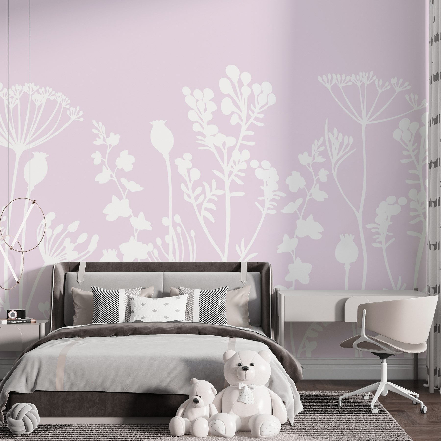Transforma cualquier habitación en una escapada de ensueño con este impresionante mural de flores y hojas blancas sobre un suave fondo rosa. Es como llevar un apacible jardín al interior, sin los insectos ni el polen. Imagínese sentado en su sofá, tomando una taza de té, mientras los diseños florales susurran dulces palabras. Perfecto para un rincón de lectura acogedor o un dormitorio chic, este mural baila con sencillez y elegancia. Además, el sutil tono rosa añade calidez, haciendo que el espacio resulte acogedor y luminoso. Es como un pedacito de naturaleza, para alegrar los días y despertar sonrisas. ¿Quién iba a decir que las flores podían ser tan buena compañía?