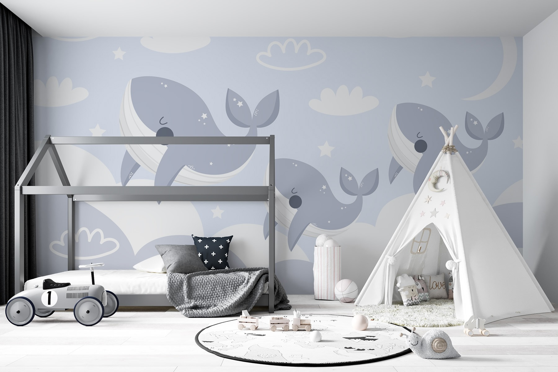 ¿No te imaginas relajándote en una habitación decorada así? Los colores relajantes y el ambiente lúdico crean un escape perfecto del ajetreo diario. Ya sea en el cuarto de juegos de los niños o en un rincón acogedor del salón, estos encantadores gigantes marinos crean un ambiente alegre.