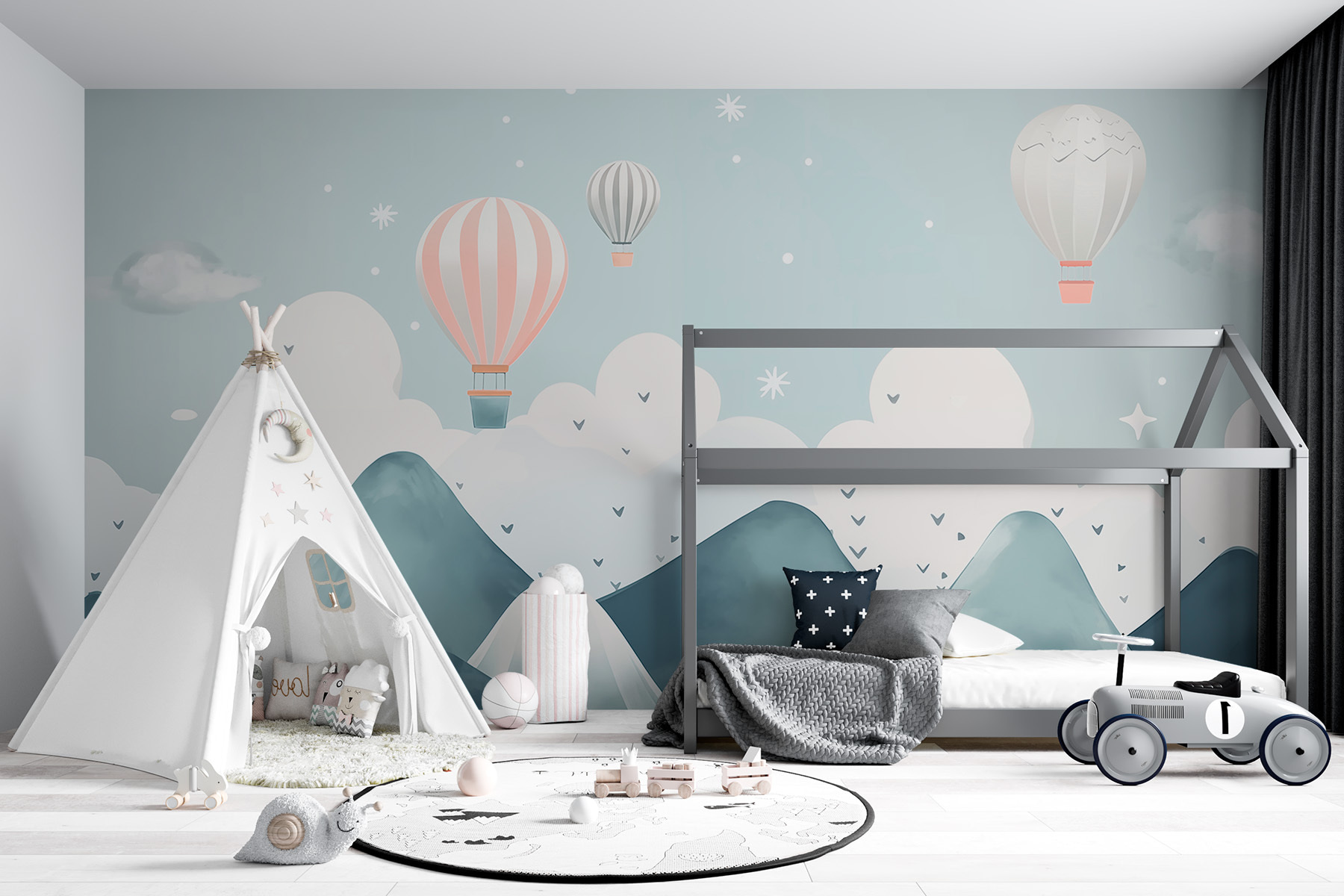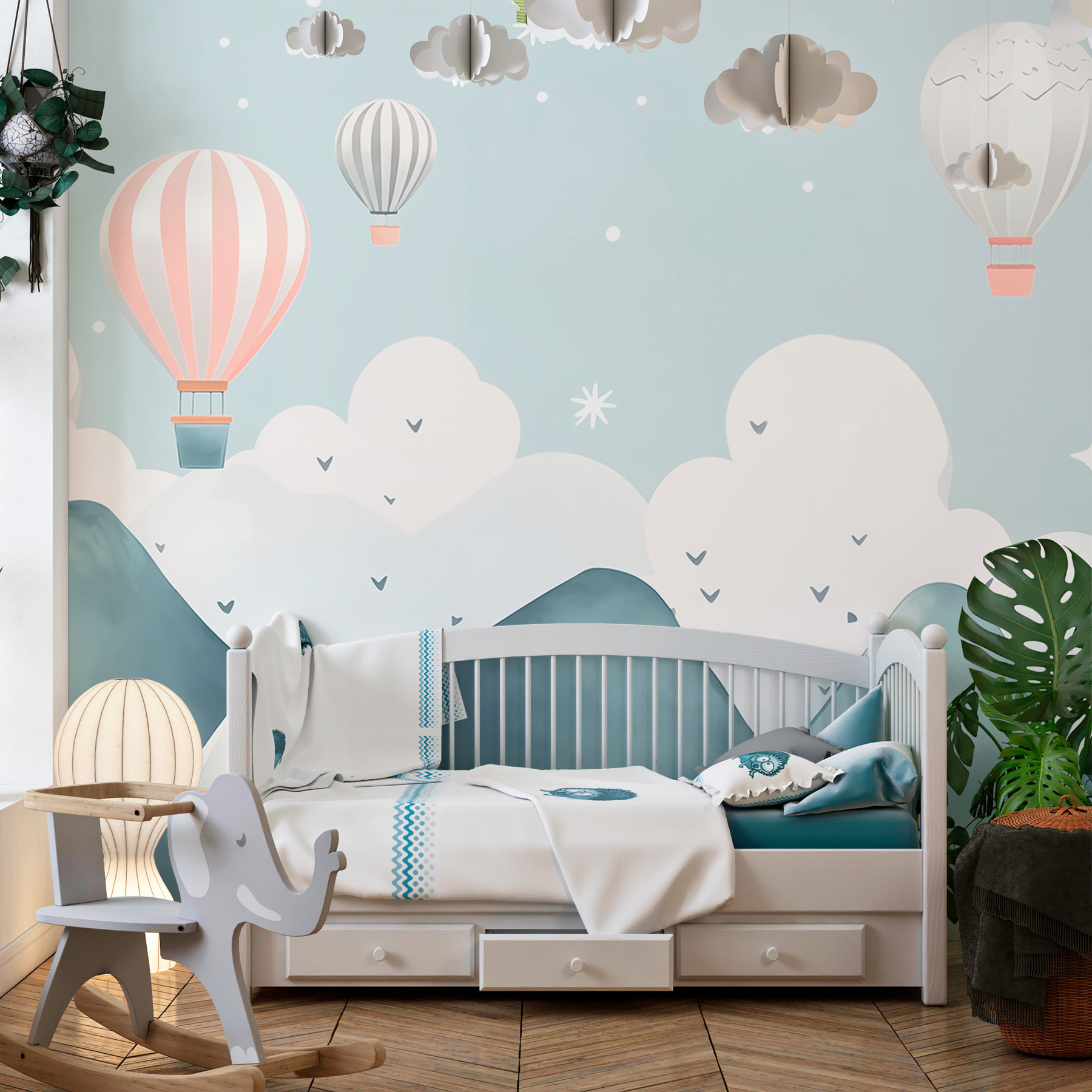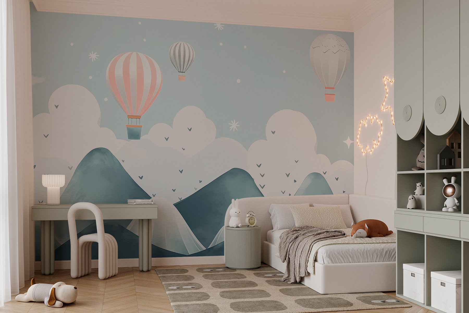 Eleve su espacio con este encantador mural que muestra globos aerostáticos flotando graciosamente sobre montañas de ensueño. Imagina despertarte con esta serena escena cada día, ¡es como entrar en una acuarela! Los azules suaves y los toques de color invitan a la calma, por lo que es perfecto para un salón acogedor o un dormitorio tranquilo. Imagínate los domingos perezosos con una taza de café, a la luz del día, mientras sueñas despierto con flotar entre las nubes. Añade un toque de fantasía a tus paredes: ¡puede que te inspire un poco de aventura! Quién sabe, puede que incluso la pared empiece a susurrarte dulces planes de escapada.