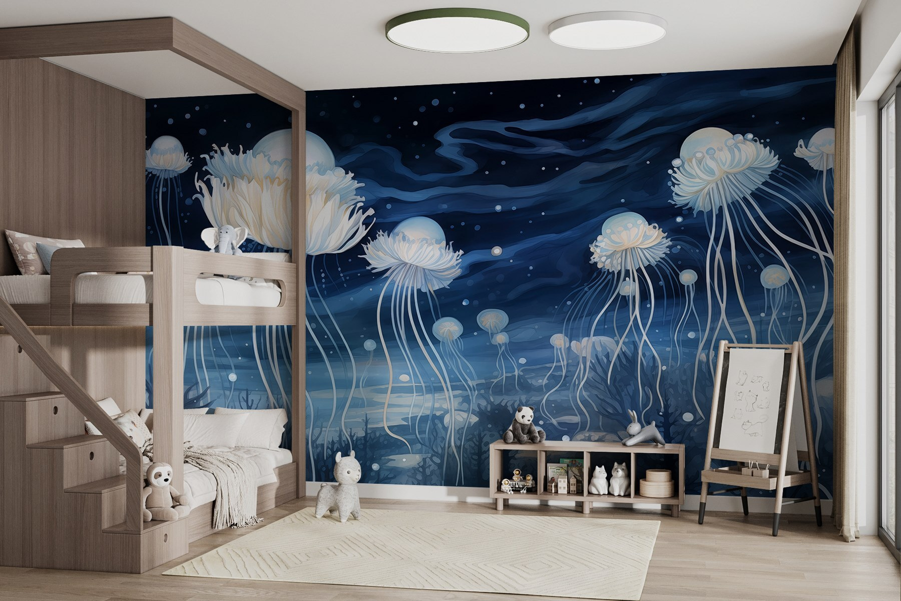 Transforme cualquier espacio en un relajante paisaje submarino de ensueño con este impresionante mural de medusas deslizándose en una noche estrellada. Imagínese esto: al entrar en la habitación, es como flotar en un océano de tranquilidad, ¿verdad? Los suaves azules y blancos de las medusas danzan con gracia, mientras que el cielo nocturno se llena de pequeñas estrellas, dando ese ambiente etéreo. Perfecto para una sala de estar o un rincón de lectura acogedor, puede que te encuentres soñando despierto, perdido en tus pensamientos. Además, es un tema de conversación. Puede que tus amigos te pregunten si has estado nadando con medusas. Imagínate su sorpresa cuando les digas que no, que sólo has estado en casa.