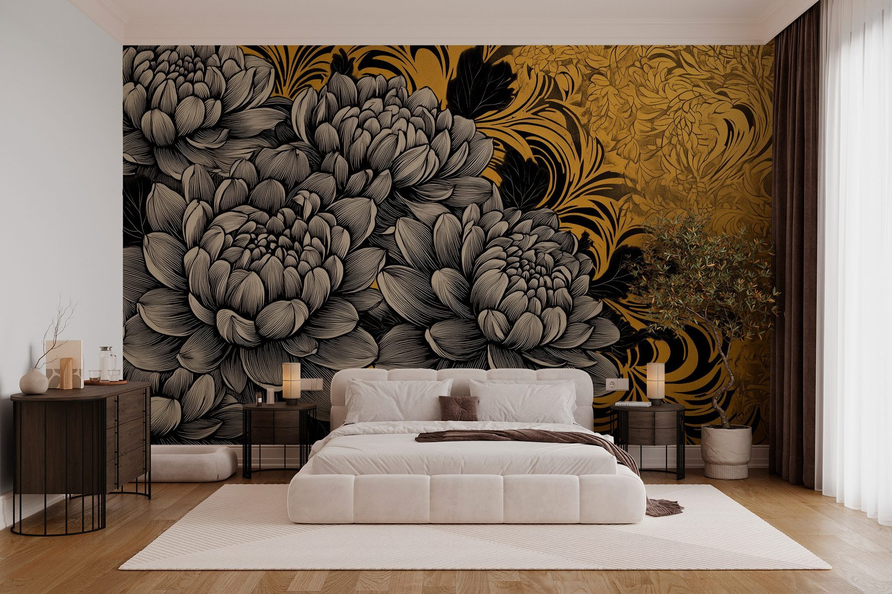 Transforme cualquier pared aburrida en una obra maestra floreciente con este exquisito mural floral en negro y crema. Imagínese esas preciosas flores retorciéndose y girando a través de su espacio, casi como si estuvieran bailando. Los intrincados detalles aportan un ambiente elegante que puede hacer que cualquier habitación se sienta un poco más viva. Imagina que te despiertas, te tomas un café y te recibe esta impresionante vista. Es como entrar en un paraíso botánico, ¡pero sin los estornudos provocados por el polen! Perfecto para una sala de estar o incluso un rincón acogedor, este mural promete ser un tema de conversación. ¿Por qué limitarse a decorar cuando se puede crear?