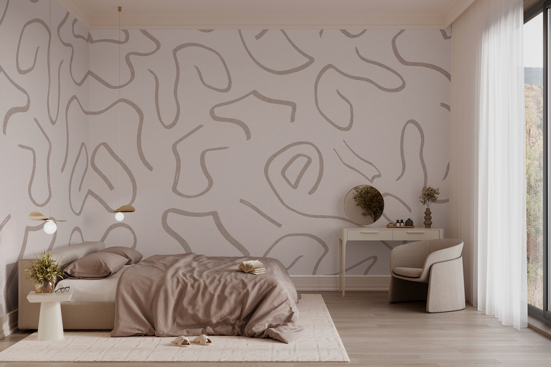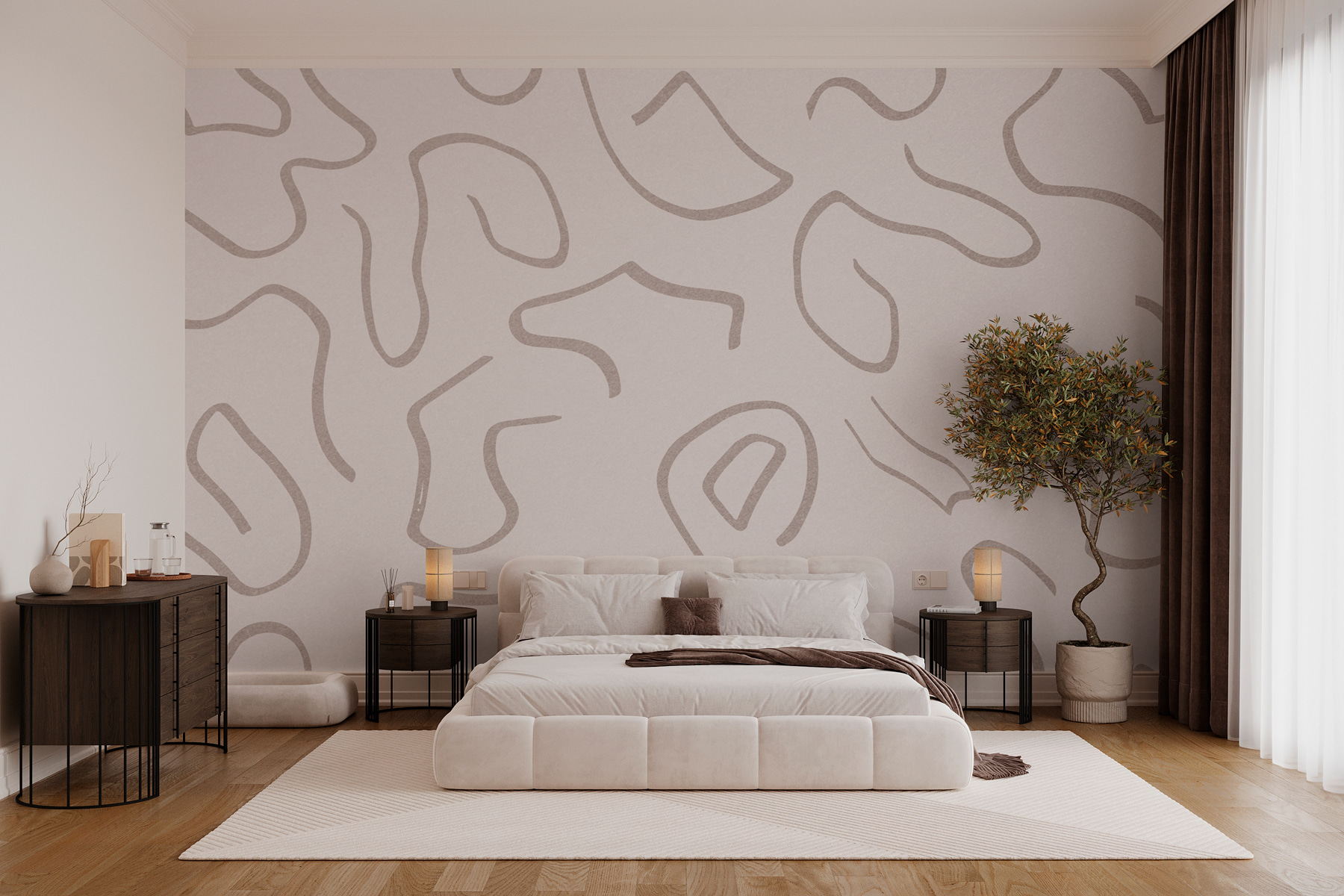Imagínese entrar en una habitación y sentir al instante un ambiente acogedor, todo gracias a las juguetonas líneas de este mural que bailan sobre un suave fondo blanco. Es como arte en el que te puedes apoyar, invitándote a trazar esas curvas con los ojos. Perfecto para espacios que necesitan un soplo de aire fresco, este diseño añade un toque de elegancia moderna sin dejar de ser acogedor. Ya sea en un rincón alegre o en un salón relajado, imagínese a sus amigos reunidos, charlando sobre la vida y perdiéndose en esas fascinantes formas. ¿Quién iba a decir que las paredes podrían suscitar conversaciones tan alegres?