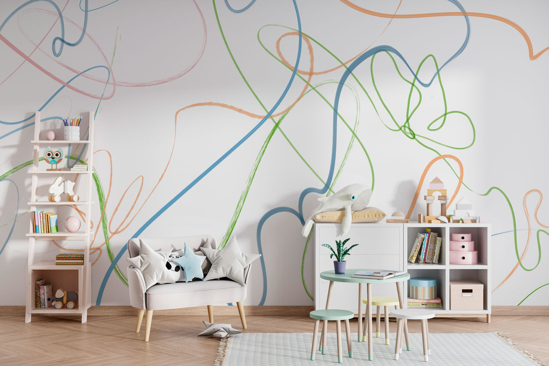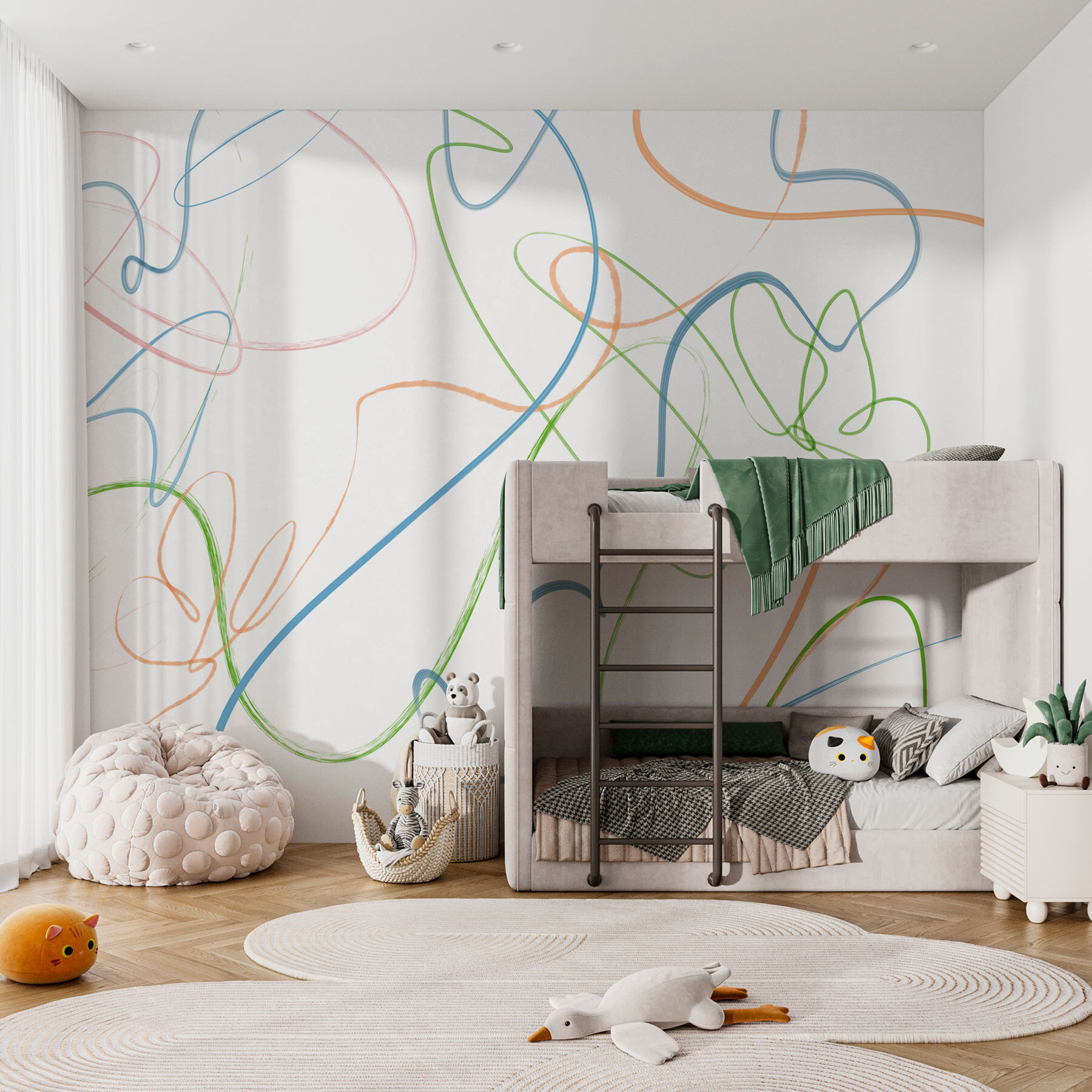 Alegre cualquier habitación con este caprichoso mural de pared, “Líneas de colores sobre fondo blanco”. Es como una juguetona danza de colores que se arremolinan y giran sobre un lienzo limpio. Imagínese entrar en una habitación donde las paredes le animen cada mañana: ¿quién no se sentiría un poco más inspirado?