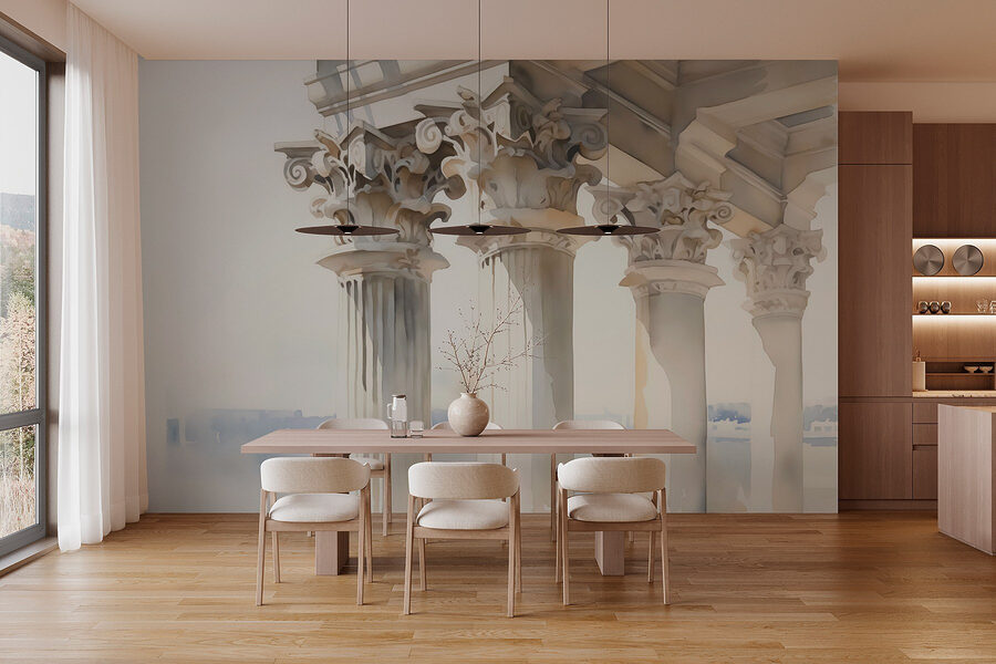 Transforme cualquier espacio en una escapada serena con este cautivador mural de acuarela de un gran edificio enmarcado por columnas que se balancean suavemente. Es como dar la bienvenida a un trozo de arquitectura suave y de ensueño directamente en sus paredes. Imagínese tomando un café o acurrucándose con un libro, sintiéndose como si estuviera perdido en un tranquilo paisaje urbano. Los tonos apagados invitan a la relajación y la creatividad, perfectos para esas tardes en las que “necesito un momento”. Es una forma ingeniosa de hacer una declaración de intenciones sin demasiadas complicaciones. ¿Quién iba a decir que añadir estilo podía ser tan mágico?