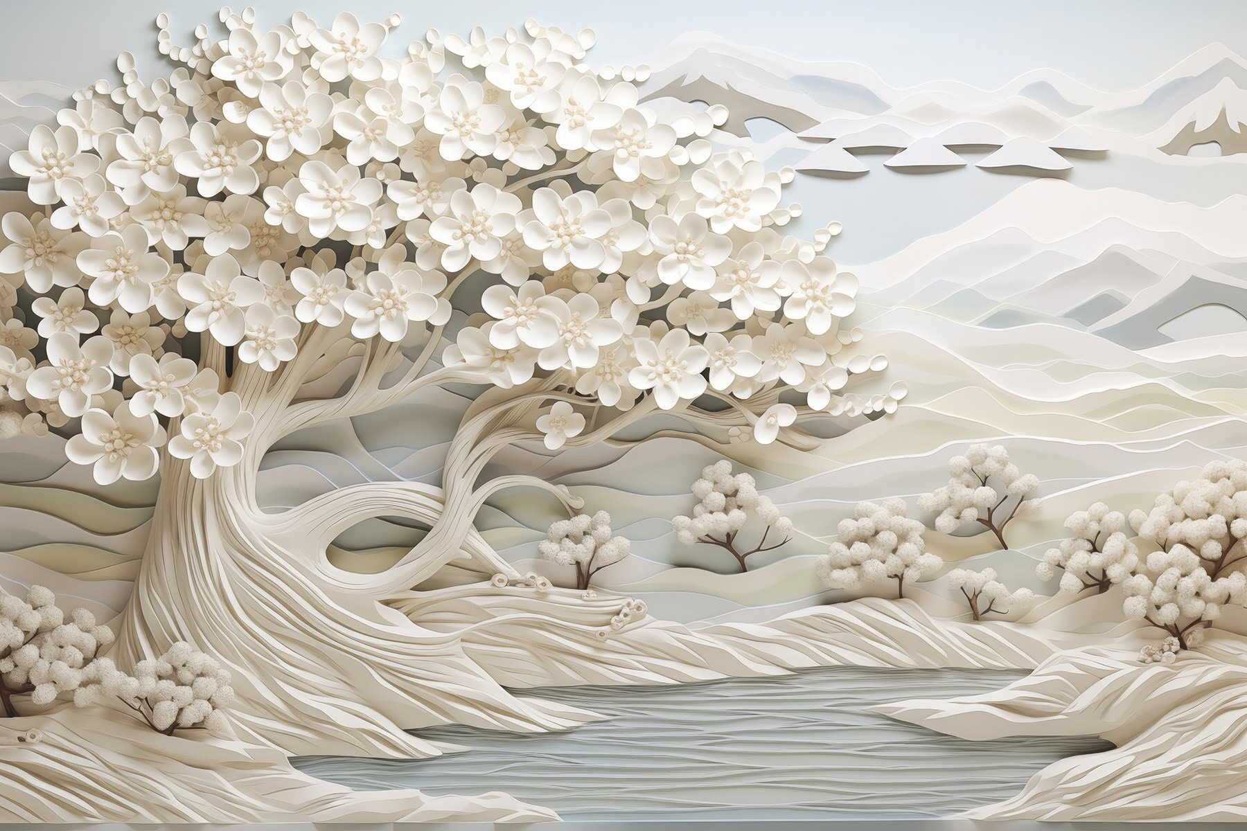 Transform any space into a serene escape with the “White Tree with White Flowers and a River” mural. Imagine stepping into a world where whispering petals and gentle water flows are just a glance away. This mural, with its soft hues and intricate details, invites daydreams and peaceful moments. It’s like bringing a piece of nature indoors—perfect for anyone who loves a touch of calm. Whether it’s in a cozy reading nook or a lively living room, this mural promises to be a conversation starter and a daily reminder of beauty. Plus, who wouldn’t want to pretend they live by a tranquil river?
